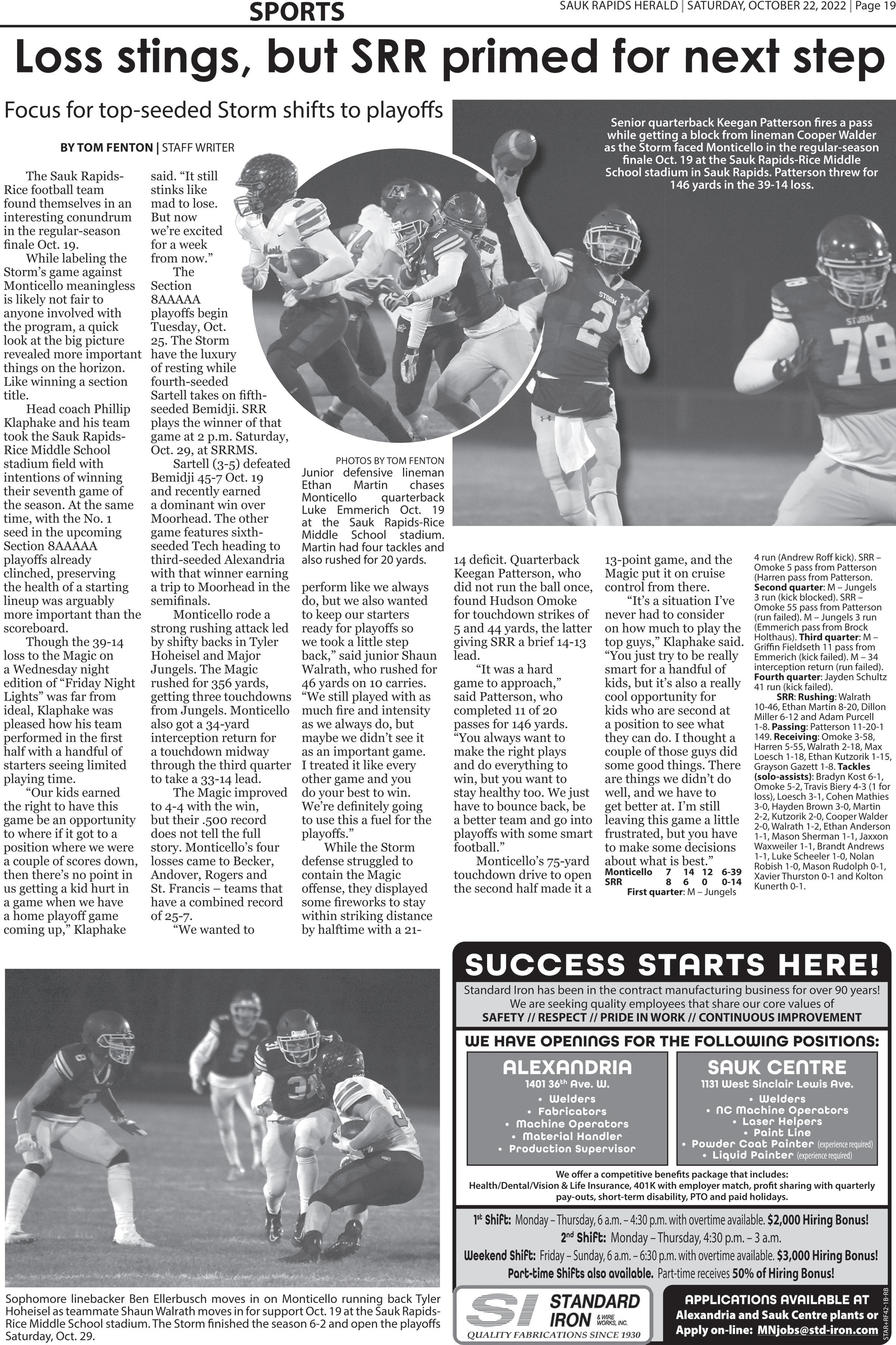 Kade Lovell Grant Pallansch, Annika Beierman Noah Middendor f, SAUK RAPIDS HERALD | SATURDAY, OCTOBER 22, 2022 Page 13Page 12 SATURDAY, OCTOBER 22, 2022 | SAUK RAPIDS HERALD This sports page brought to you courtesy of the sponsoring businesses: Sauk Rap sthe less you drive the more you save Not available in every state. In some states, prices vary based on driving behaviors. Based on annual premium paid by Allstate standard auto customers vs. Allstate pay-per-mile customers who drive an average of 4,000 miles a year. Savings vary. Subject to terms, conditions and availability. Allstate Fire and Casualty Insurance Company & its affiliates © 2022 Allstate Insurance Co. 16884717 Tony Jarousek Agency 320-202-8688 225 N. Benton Dr., Ste. 100 flavor. REMARKABLE 110 1st St S Sauk Rapids (320) 252-2141 2803 Clearwater Rd, Suite B | Saint Cloud @Coilsflags Every yard looks better with a Flag (320) 253-8160 www.coilsflags.com Go Storm! Storm! 603 N Benton Dr, Sauk Rapids 320-251-4771 www.dandbautobody.biz New Menu Daily Food Specials! Take Out Available 320-252-0451 736 S Benton Drive • Sauk Rapids OPEN EVERYDAY FROM 11 A.M.- 8 P.M. 1106 S Lincoln Ave, Sauk Rapids, MN 320-252-2110 www.dooleypetro.com Doo ey ’s Pet o eum is youDooley’s Petroleum is your leading p opane & fue p ovidepropane & fuel provider n Centra Minnesota o over 60 yearsin Central Minnesota for over 60 years. WE LIVE IN THE COMMUNITIES WE SERVE PAUL NEMETH Owner/Operations Manager/Master Electrician Lic.#AM07083 Contractors Lic. #EA003490 Cell: (320) 250-1023 Office: (320) 258-5204 702 9TH AVE. S., SAUK R APIDS, MN 56379 Family Owned & Operated Since 1978 DAnderson@HallerRealtyHomes.com www.HallerRealtyHomes.com 1310 2ND STREET NORTH SAUK RAPIDS, MN 56379 Dave Anderson Realtor 320.249.7026 The Haller Team, SUPPORTS ALL STORM ACTIVITIES. GO STORM! 8 N Benton Drive, Sauk Rapids (320)-251-5383 www.wipplerhardware.com 320.253.0208 » 22 2nd Ave. N., Sauk Rapids, MN www.jimmyspourhouse.net Stop in and try our great menu ! SINCE 320-774-2035 • www.k-kcpa.com 25 yearsof Experience! Accepting New Clients! Supporting the Storm! 1139 Franklin Ave., Ste. 3, Sauk Rapids, MN Emergency 24 Hour Services WHATEVER IT TAKES Residential/Commercial • Sales Service • Installation Heating & Air Conditioning 235 Stearns Dr., Sauk Rapids www.lyonheating.com 5 Time Recipient for Medal of Excellence Call for Free Estimate! 320.252.1371 Sheet Metal & Heating, Inc. 114 2nd Ave. N. Sauk Rapids, MN www.maneasmeats.com 320.253.8683 Family Owned & Operated Since 1975 Tractors, John Deere, and Commercial Equipment 1035 35th Ave NE Sauk Rapids, MN 56379 www.MMCJD.com • Computer Diagnostics • Tune Ups • Air Conditioning/Heating • Oil Changes • Transmission Repairs • Exhaust Repair & Replacements • Brakes • Tires and more! Mon–Fri: 7:30 am - 5:30 pm Come see why Motor Works Auto is Central MN’s #1 in Auto Service! 320.253.2262 2 Benton Dr. S Sauk Rapids, MN 56379 320-968-6239 | 888-868-6239 | Open Monday-Friday 8-6 • Sat 8-2 | www.murphychevrolet.com 211GLENSTREET FOLEY,MN56329 pinecountrybank.com YOUR H O M E T OWN BANK pinecountrybank.com Rice 750 Cty. Rd. 21 320-393-4200 Little Falls 1201 1st Ave. NE 320-632-9740 Royalton 412 N. Hwy. 10 320-584-5522 833 N. Benton Drive, Sauk Rapids, MN 320-251-4936 • www.plowworld.com Sales • Parts Service POWER EQUIPMENT Quality SinceService1969Rice, MN • 320-393-2160 Septic Systems, Driveways, General Excavation, River Rock, Boulders, Screened Black Dirt, Class #5 Gravel and More. www.saldanaexcavating.com 320.266.3949 STEVEN V. BAKER, LTD. CERTIFIED PUBLIC ACCOUNTANTS 1287 2nd St. N., Ste. 201 P.O. Box 215 Sauk Rapids, MN320.253.5175 800.252.5175 www.svbltd.com Steven Baker CPA, Corina Schlichting CPA Schedule Today Pain Goes Away 1-605-786-5327 www.tranquilheartenterprise.com 2700 1st St. N., Suite 101, St. Cloud® Therapeutic Massage ~ Bodywork ~ Reflexology ~ Meditation Myofascial Release ~ VacuTherapies ~ Far-Infrared Sauna (320) 251-2552 www.tri-countyinsurance.net LAUNDROMAT & TANNING 15 North 2nd Ave. Sauk Rapids, MN www.washntanmn.com 320.259.0882 OPEN DAILY Laundry 6 am-9 pm Tanning 8 am-9 pm We support the Storm! - Rice 2022-23 (3 7 A cross-country R. Tamm Photography 320.363.7406 www.rtammphotography.com www.brennytruck.com • 320-363-6999 When you ship with Brenny, you help us help your community! Good Luck S Stortormm! Auto - Home - Renters Business - Life - Health Ryan Stack Michael Opsahl Paul Nordquist 114 Division Street, Sauk Rapids (320) 259-8178 (800) 599-9866 mopsahl@twfg.com • www.twfgmn.net Good Luck to Allto Sports Teams! www.brandlmotors.com 14873 113th St., Little Falls, MN 56345 800-847-2502 • 320-632-2908 A Proud Supporter ofA Proud of Storm Ath et cs Athletics Free Local Delivery! Local, Independent, Family Owned!! Village Pharmacy & Gifts Village Pharmacy & Gifts 108 S 2nd Ave., Sauk Rapids, MN Village Gifts 3720 3rd St. N, St. Cloud, MN 320-252-6650 | advantageoneins.com we treat people like people. because, they’re people. simple human sense Offices in: Albany Holdingford • Long Prairie Melrose • Pierz • Sauk Centre • St. Cloud 320-387-3540 freds-plumbing.com Complete Plumbing, Heating & A/C Service & Repair We’ll keep you in your comfort zone!