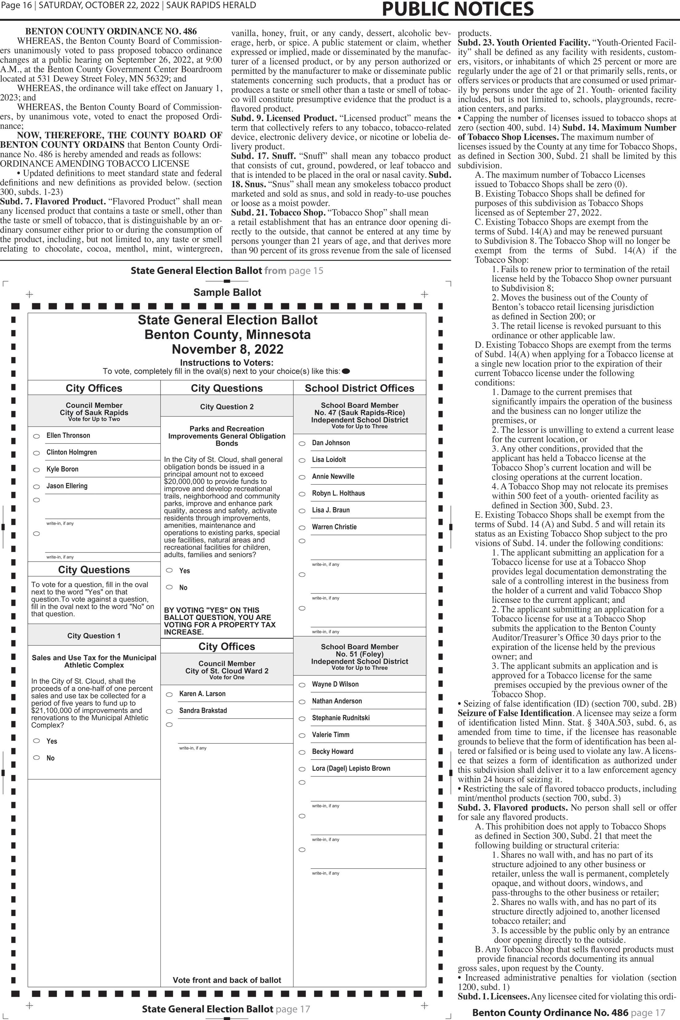 Smolnik OBITUARIES • Probate Notice - Drager p.15 • Assumed Name - Extreme Shears p.15 • Notice of General Election Sauk Rapids-Rice School Ballot p.15 • Benton County Sample Ballots p.15 • Benton County Ordinance 486 p.16 • Benton County Minutes p.17 • State General Elections Sample Ballot p. 10,14, 15, 16, 17, 18 • Notice of General Election City of Sauk Rapids p.15 • City of Sauk Rapids Public Hearing p.10 • Public Accuracty Test of Equipment p.14 THANK ALL VETERANS FOR THEIR SERVICE (320) 253-8160 // www.coilsflags.com 2803 Clearwater Rd., Saint Cloud, MN 56301 @Coilsflags Stop by Coil’s for a new Flag orStop Coil’s for a new or Patriotic Framed Ar t Art R42-4B-BL