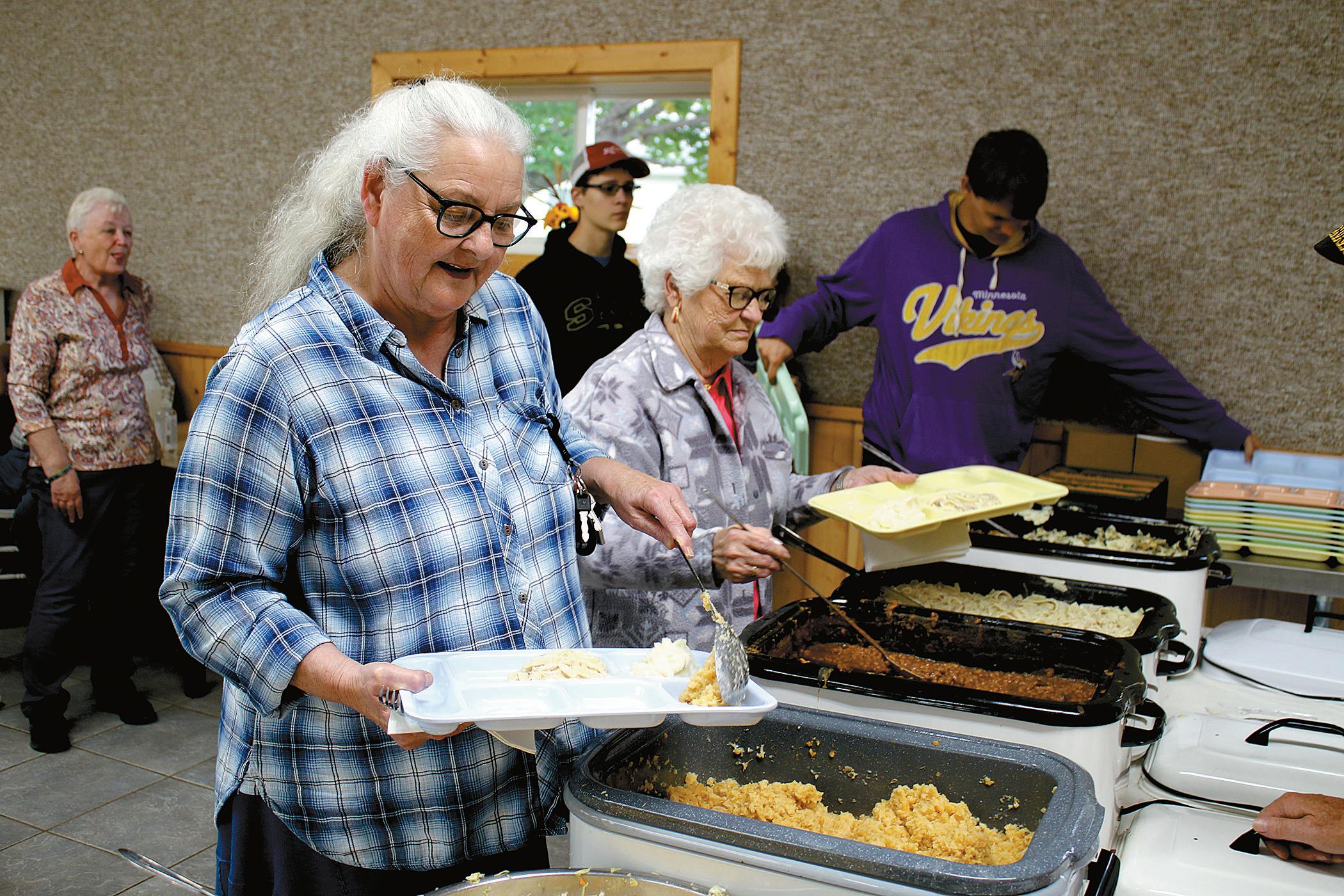 Janet Schinski puts the potatoes she prepared into a roaster Oct. 2 in Burtrum. Schinski has been working at the bean bake for 70 years, starting when she was 10 years old.