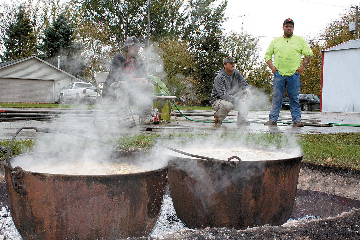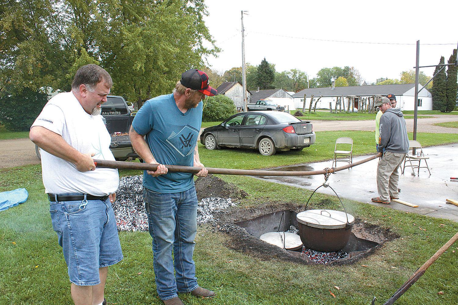 Seth Strassburg stirs ingredients, such as side pork, as the beans simmer and boil Oct. 1 in Burtrum. The tradition of a bean bake goes back 125 years.