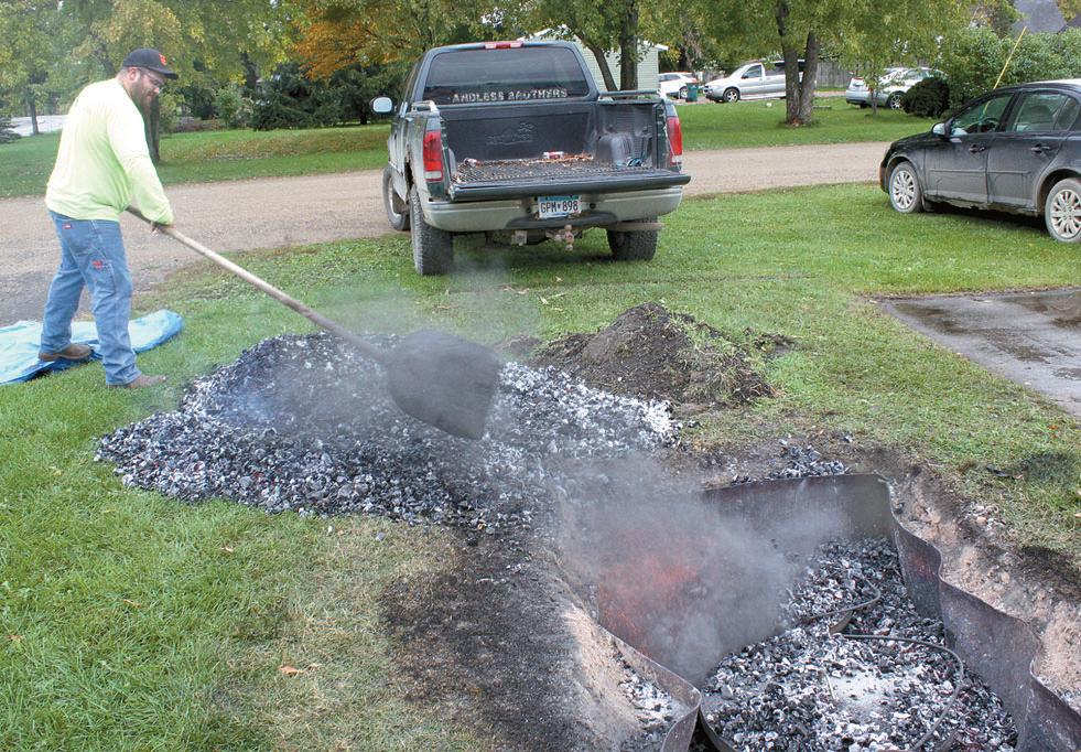 The day before the dinner, at about 7:30 or 8 a.m. at the community center, a fire is started to heat the coals used for baking the 100 pounds of beans. At about 1 p.m. the cooking of the beans