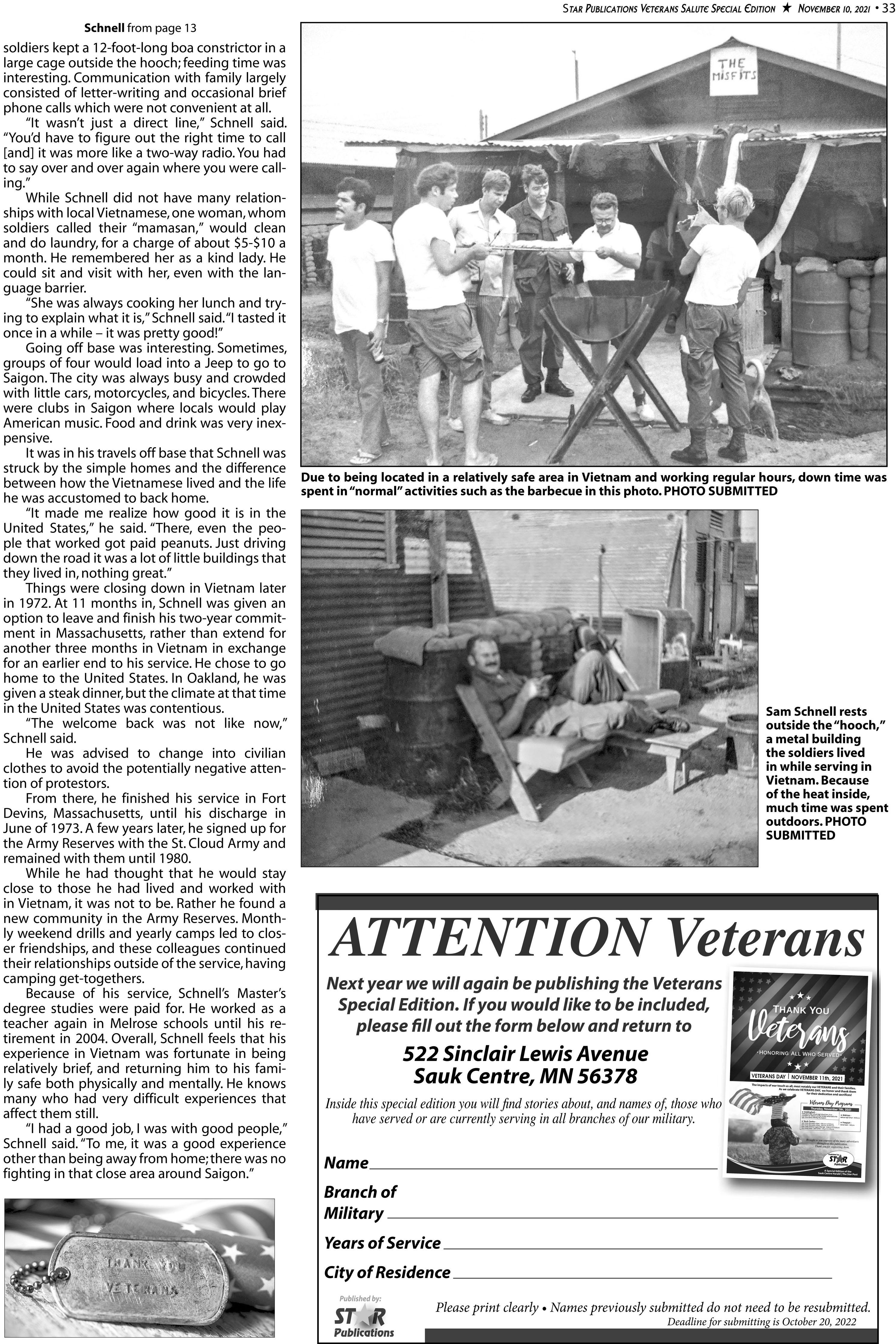 MELROSE – Sam Schnell has been a teacher much of his adult life, until his retirement. Working in the Melrose schools teaching industrial arts and special education has been a consistent service that he has offered to the Melrose community for many years. There is another service he completed, and that is his service in the U.S. Army in Vietnam, where he was deployed when he was 24 years old. Subsequently, he spent years in the Army Reserves.