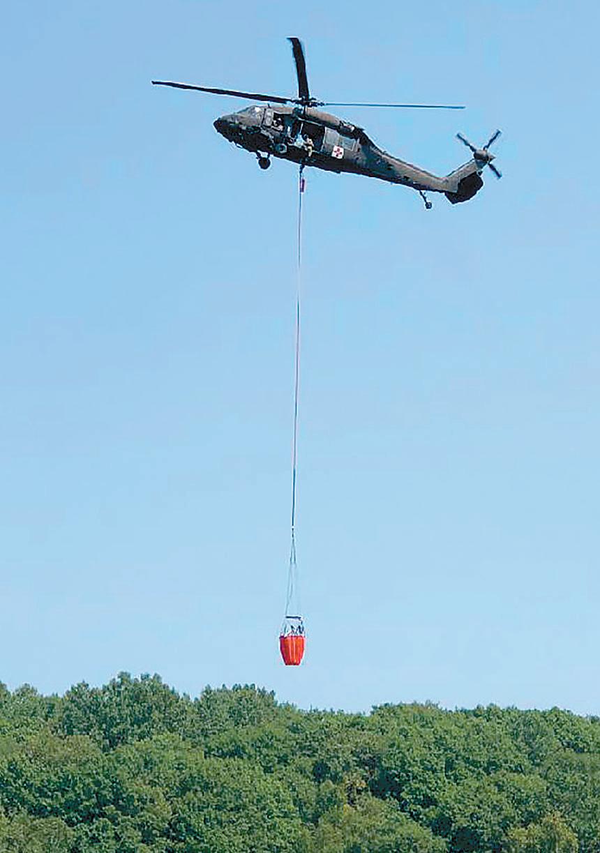In preparation for wildfire missions, the DNR trains with Nicole Westbrock’s company to put out practice fires at Camp Ripley with water buckets holding approximately 500 gallons of water.
