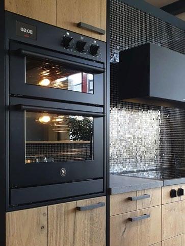 Eine Oxford-Küche spricht durch die Details: rauchschwarz lackiertes Gehäuse, schwarz emaillierte Kochfläche, Rückwand mit eingraviertem Firmennamen, dekorative Scharniere, analoge Uhr. Viele geschickt zusammengestellte Besonderheiten, die der Serie ihren Charakter verleihen. Für alle, die eine Umgebung im Retro-Look nachempfinden möchten, für jene, die der Faszination sichtbarer Verschraubungen unterliegen und die amerikanische Fernsehserien der 50er und 60er Jahren lieben.