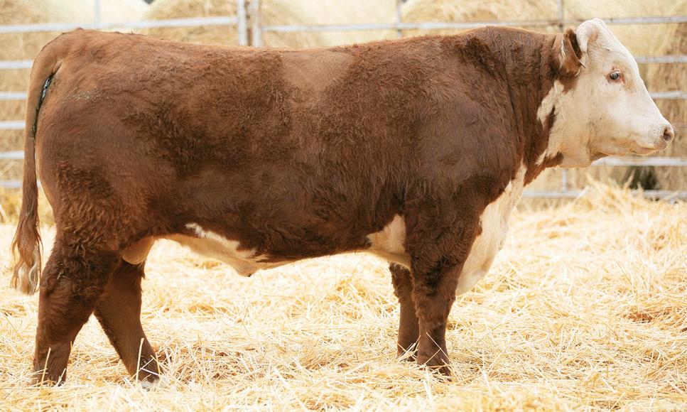 This striking daughter of 5107C is a square made, ultra-feminine and beautiful uddered female that is out of the 3075A donor from Holden Herefords. Moderately designed and efficient, 9067G excels at calving ease and maternal prowess. This is one of the most royally bred females in the sale.