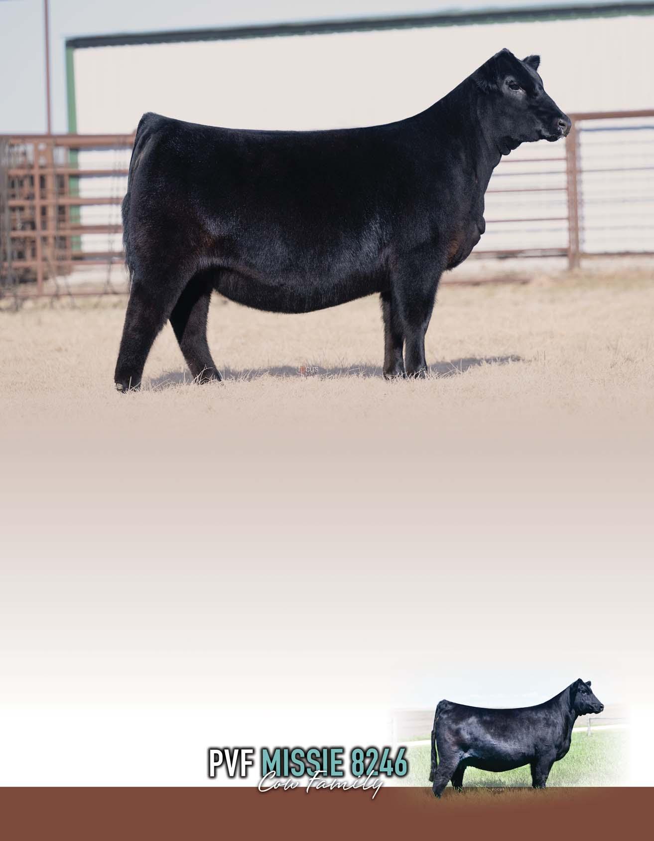 The first of four daughters of the legendary PVF Missie 6228 in this offering. Her numerous sale features and high sellers include three full sisters to this heifer who averaged more than $100,000 in the Spring 2023 PVF Production Sale. This heifer’s dam was a past Reserve Grand Champion Angus at the National Western Stock Show, and her daughters include PVF Missie 9214 and PVF Missie 1124, who were both division winners at the National Junior Angus Show.