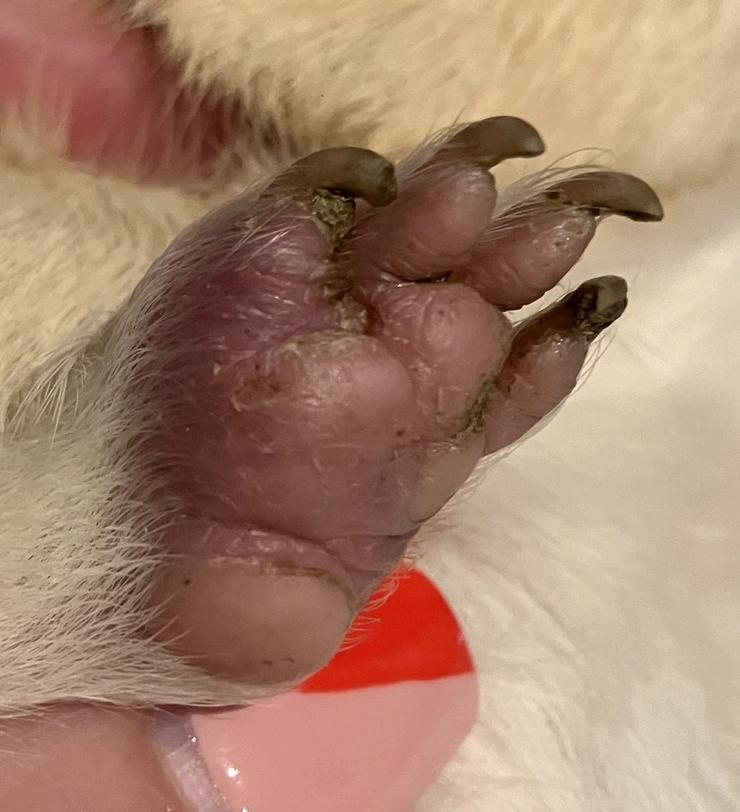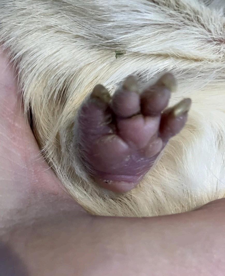 Guinea pigs can also suffer from fungal feet, much the same as our athletes' foot, which can look like they have white, dry flaky pads. Black pads may look grey, but both feel rough to the touch. As a mild condition progresses, it can infect their toes causing swelling at the nail bed and a yellowing and brittleness of the nails as they grow. There are some genetic abnormalities that affect paws such as a guinea pig having an extra toe, Polydactyl, which is usually on their back foot. This sometimes looks as if it is hanging off the side of their foot. These extra toes can often get caught on soft materials so may need removing. Check your guinea pigs' feet over regularly to catch any of these medical issues early to ward off it developing into something more serious.