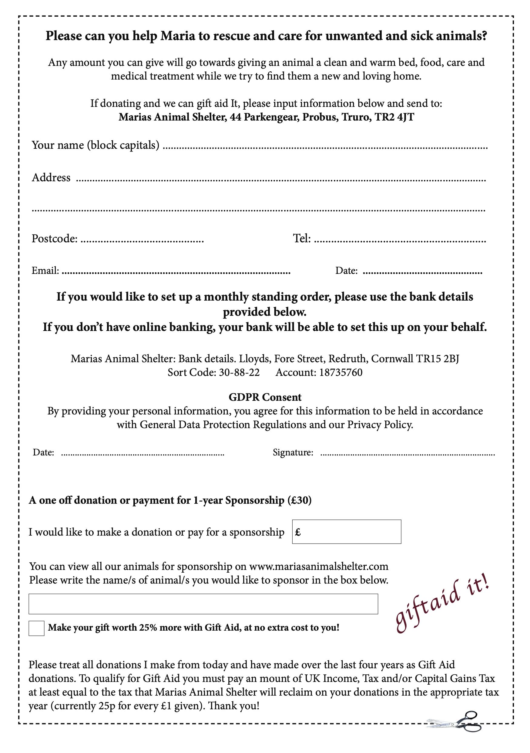 Marias Animal Shelter: Bank details. Lloyds,Market Street, Camborne, TR14 8JT