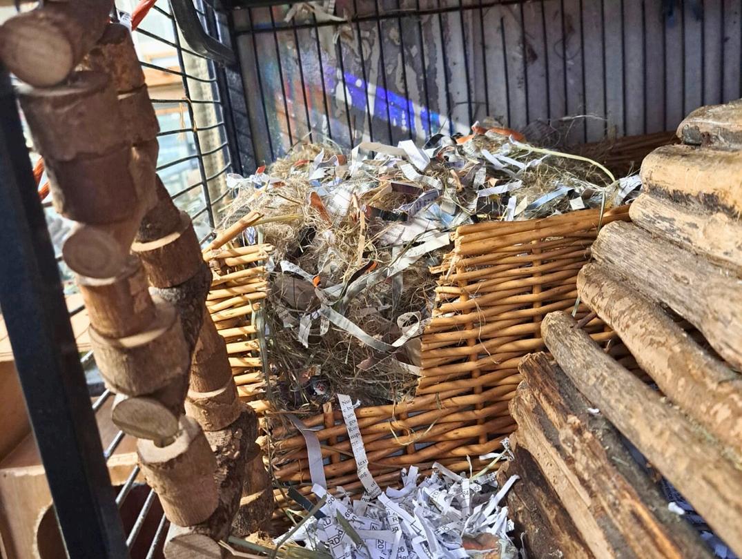 A mix of shredded paper, high-quality hay, and hemp works well for the floor A digging box made from natural materials, like a wicker basket, would be ideal, or you can make your own out of wood. Cut a hole in the side for an entrance or add ladders from the top to the bottom and fill it with various materials.