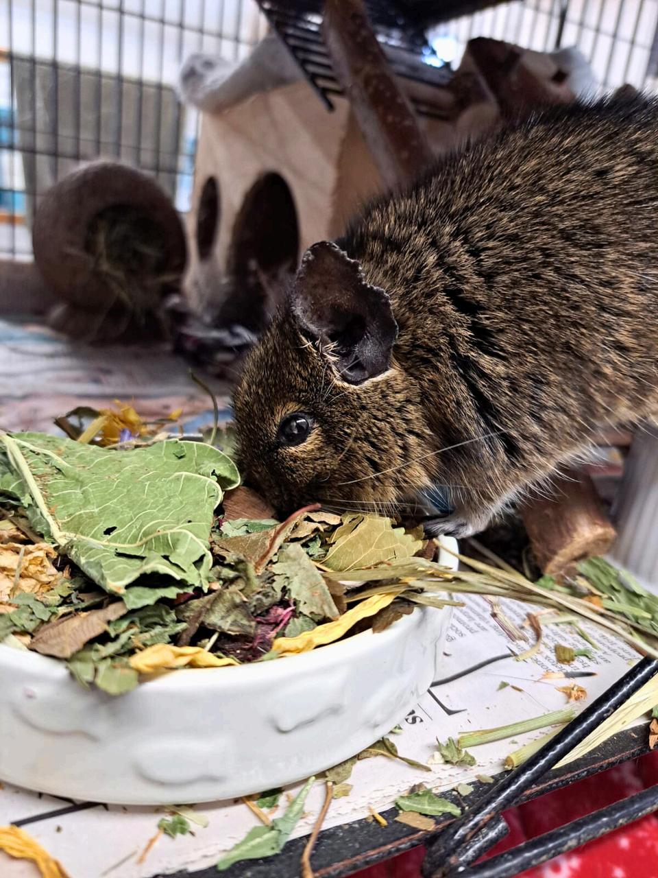 Degus are an exotic species, and potential owners must conduct extensive research before caring for them. Their diet is quite comprehensive, and if not followed, it can be detrimental to their health. Sugar cannot be given to them, as it can lead to diabetes. There are many types of food available for purchase, but at the shelter, we have found that all the degus enjoy Science Selective degu nuggets We only provide a 5% ration, which is approximately 10 nuggets. The primary food we purchase is imported from Germany and is the best natural food for degus. The company is called Hansmann, and the food is Pflanzenmischung.