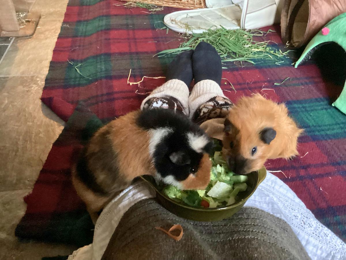 The two we have recently adopted are called Teddy and Snoopy. They were already bonded and do get on well. My husband has built them an 8ft run complete with extra sun terrace in our dining room. So, they get lots of attention. Also, in the afternoon they have the run of the lounge for a few hours, which for them is play time. They run around like mad things, pop corning and swerking all over the place, demonstrating how happy they are. To me and my husband seeing them so happy makes our heart sing. I love the way Guinea-pigs are very vocal, and squeak when their vegetables are ready. Teddy is particularly cheeky and will stand on the upper terrace of the enclosure bobbing his head up and down squeaking for a treat, it really makes us laugh.