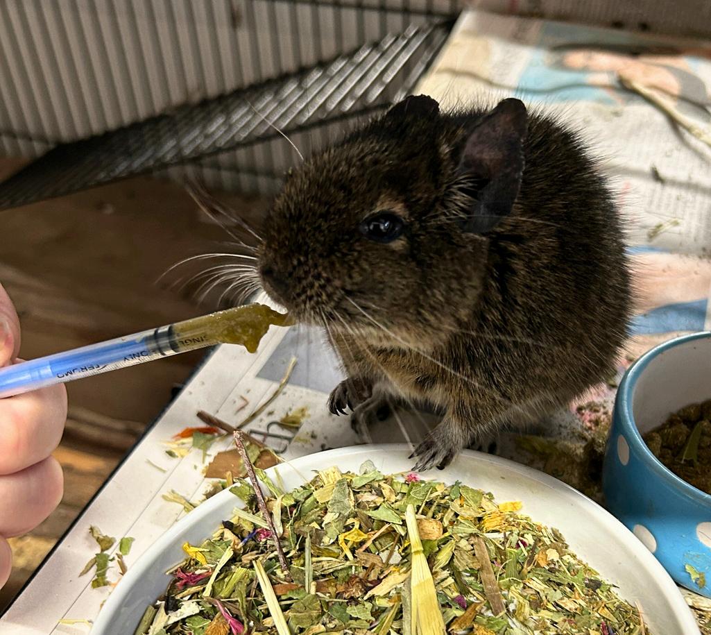 Degus are so much fun to be around, always running on their wheels and releasing the high energy they possess They appreciate human contact, but only after their initial fears have been addressed One pair of degus entered the shelter due to domestic abuse and were terrified of humans; it took many months before they could even be seen at all. Never rush the bonding process. Allow degus to approach you when they are ready, gently encouraging them with a sound they will associate with positivity and rewarding them with a treat, such as a pea flake or a degu crockyummy! We give a pea flake every morning but let the degu come to us on their own terms, watching carefully to ensure the pea flake is eaten. This ensures that the degu is healthy. Degus can pretend to eat because they are a prey species. They typically live up to seven years, but we have had several live to ten years As with all animal species, an extended lifespan can lead to ailments like arthritis, making it crucial to take them to an exotic or degus-savvy vet for diagnosis and treatment. Providing any animal with a pain-free life is an honour and contributes to their happiness for many more years. It is also quite easy to give degus medication. Most do not like being handled for medicine administration, but you can disguise it by making what is often called “Degu crack. “ This mixture includes critical care combined with a very small amount of vegetable baby food and peanut butter. Draw a little into a 1ml syringe (with the bottom cut off), add the medication, followed by a little more of the mixture. Degus cannot get enough of it.