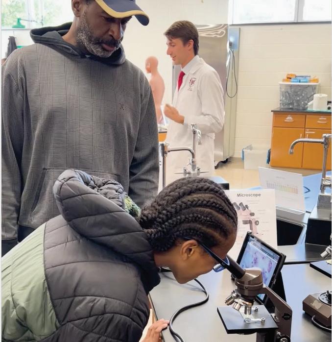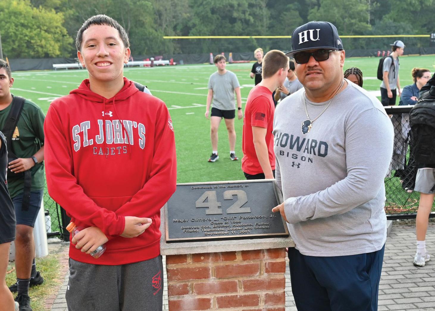 On September 11, Cardona returned to campus for his annual visit to classmate MAJ Cliff Patterson’s plaque. Cardona attributes his success at St. John’s to Patterson’s friendship and support. The close friends also attended Howard University together. Cardona’s son, Luis ’28, was one of 100 cadets participating in SJC’s annual Cadet Corps September 11 stair workout to remember and honor Patterson and all those who died 23 years ago.