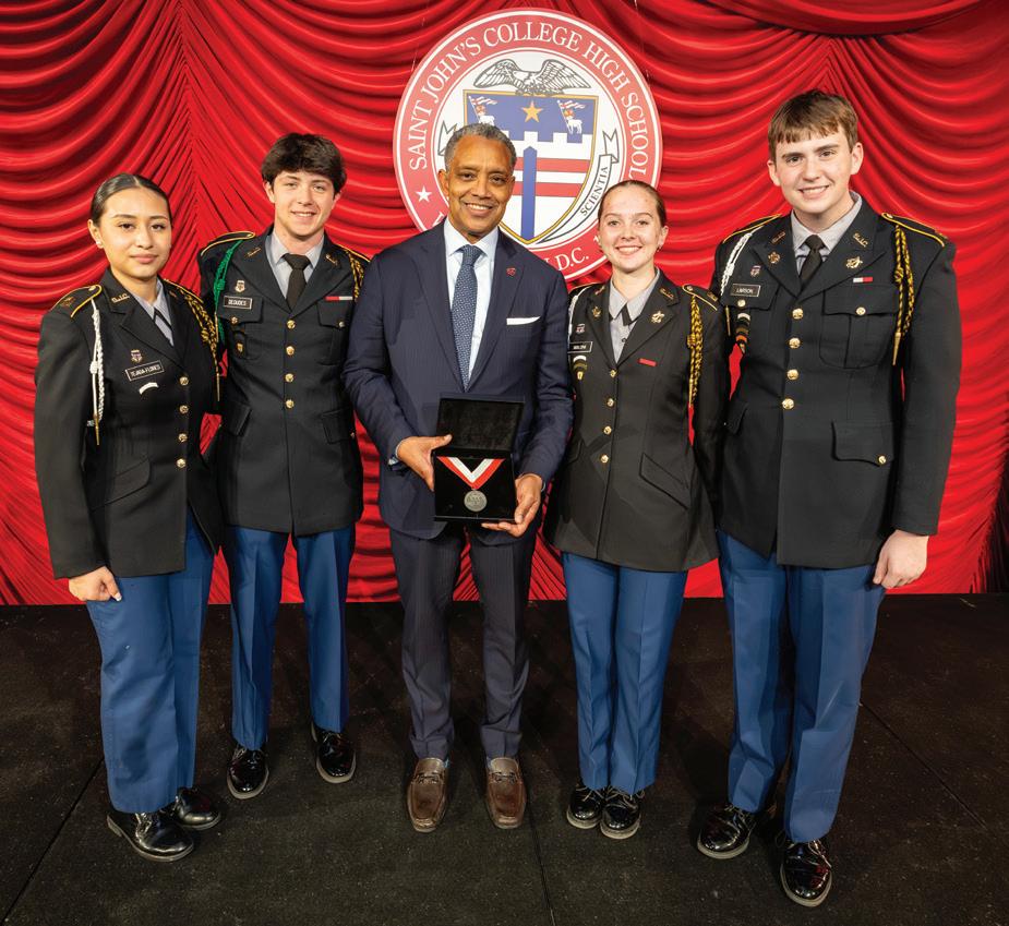 On November 8, St. John’s honored six outstanding Cadets with the President’s Medal, the school’s highest honor. Traditionally, this medal is awarded to distinguished alumni and friends of the school who have given extraordinary service to St. John’s and the greater community. The 2024 awardees were Edward C. Gibbs ’67, John Poole ’71, Karl Racine ’81, Jadranka Von Koprivnjak-Stojcic, and Roger and the late Deborah Whyte P ’04, ’06, ’12.