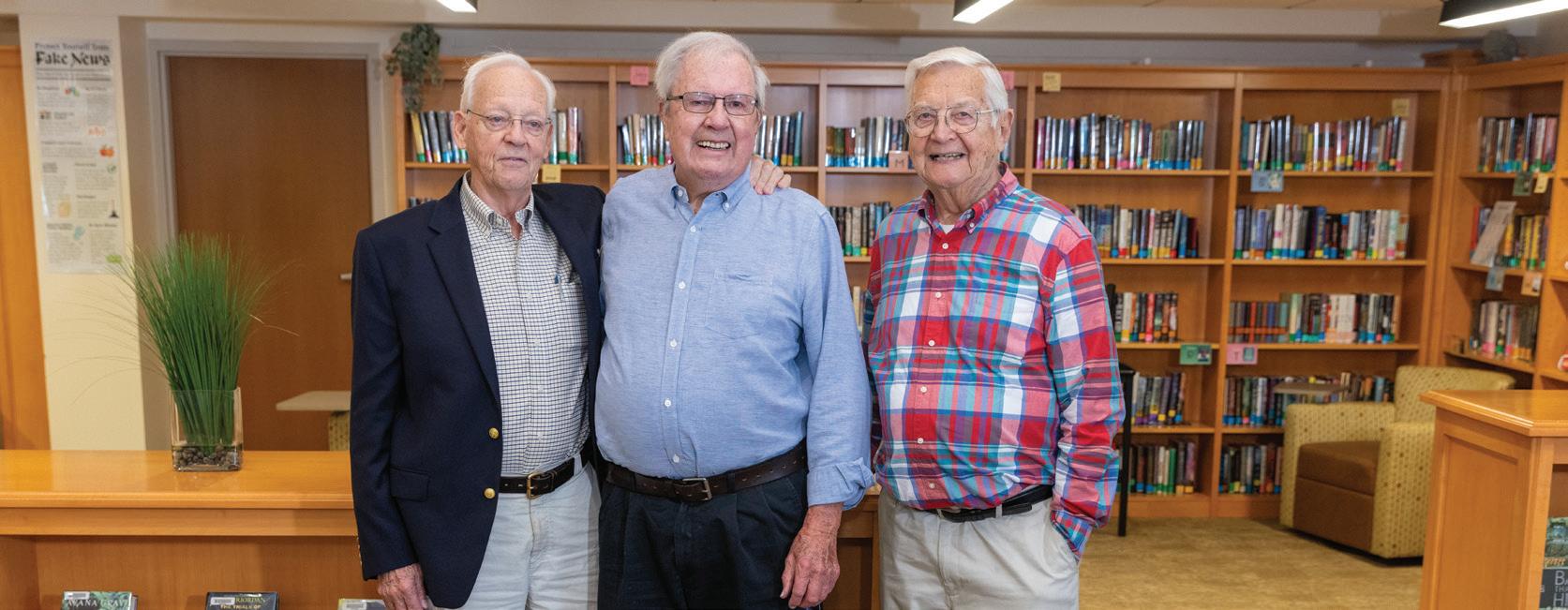 Ted Trabue, Ron Ross, and Tom Graham reminisce at a birthday party for a former colleague.