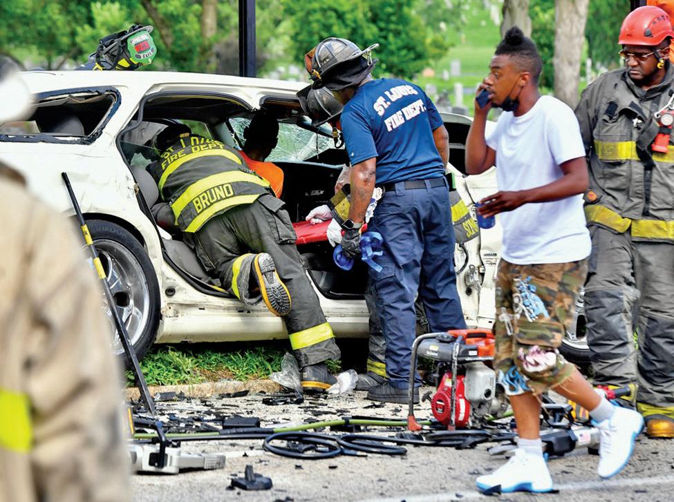 St. Louis firefighters work to free pasengers from a vehicle involved in a three-car collision that sent six people to the hospital Tuesday afternoon. The accident was near the intersection of West Florissant and Thrush in the city’s Walnut Park East neighborhood.