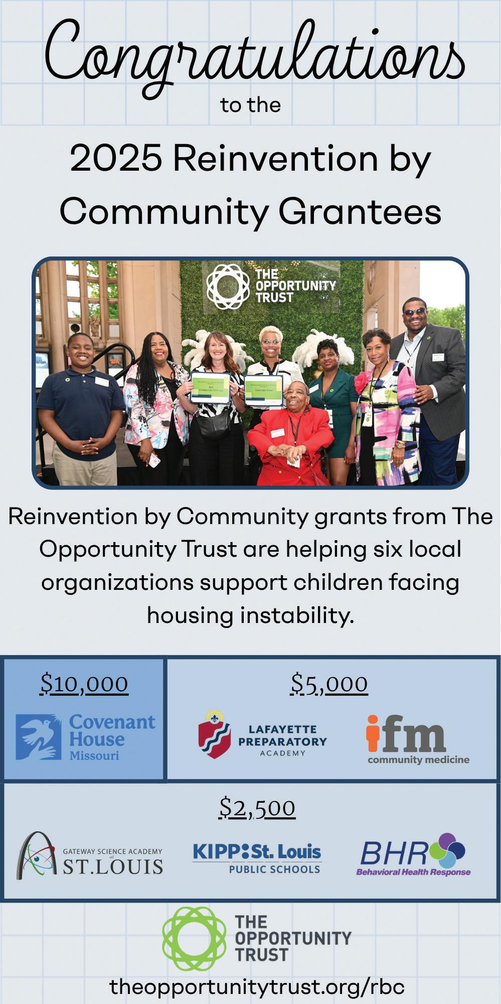 As families across St. Louis pick up the pieces after the May 16 tornado, the urgency for stable housing and student support is reaching a breaking point. In response, six local organizations have been awarded a combined $27,000 in microgrants from The Opportunity Trust’s Reinvention by Community (RBC) initiative to help youth facing housing instability and support families in need.