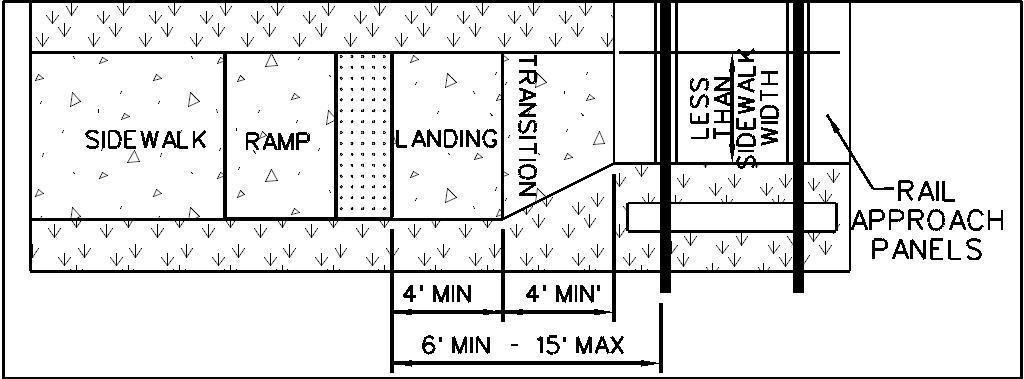 • Sidewalk Ramps shall have level landings at the top and the bottom of each ramp run. Level landings shall be at least as wide as the widest ramp leading to the landing, be a minimum of 5 feet in length and have a 2.0 percent maximum slope in any direction.
