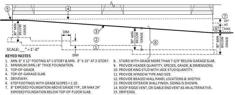 • Notice: Garage foundations with more than 2’-0” of unbalanced backfill and parking surcharge must be designed by a Missouri registered design professional. Submit properly sealed electronic sets of structural drawings and set of calculations. Drawings shall include plans, sections, connection details, materials requirements, and construction notes and be scaled, dimensioned, labeled (B107.2.1; R301.1.3).