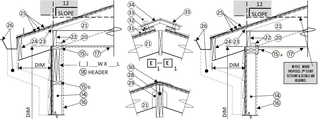 • Approved roof tie-down anchorage (clips) is required for the first 8’-0”, measured from the corners of gable ends, and must meet capacity requirements of the 2015-IRC Table R802.11 per footnote d):