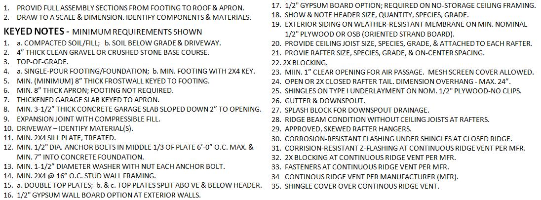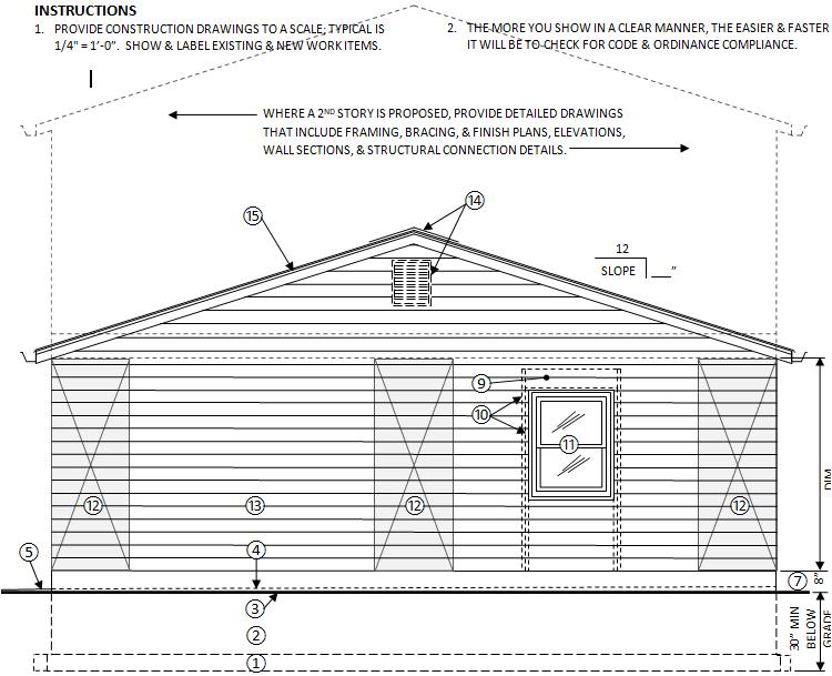 • See the example drawings at the end of this checklist for reference in completing your own projectspecific drawings. The lists below are Code and Ordinance requirements for a residential Attached Garage to be provided in your drawings and notes.