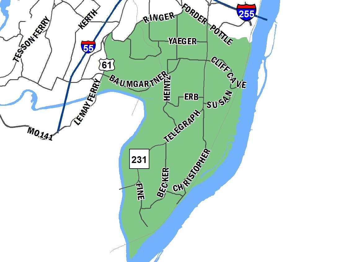 Oakville is an unincorporated community located in south St. Louis County, Missouri between I-55 and the Mississippi River. It is served by the Mehlville School District, the 4th St. Louis County Police Precinct and the Mehlville Fire Protection District. Nearby attractions include South County Center, Kennedy Recreation Complex, Cliff Cave Park and Bee Tree Park.