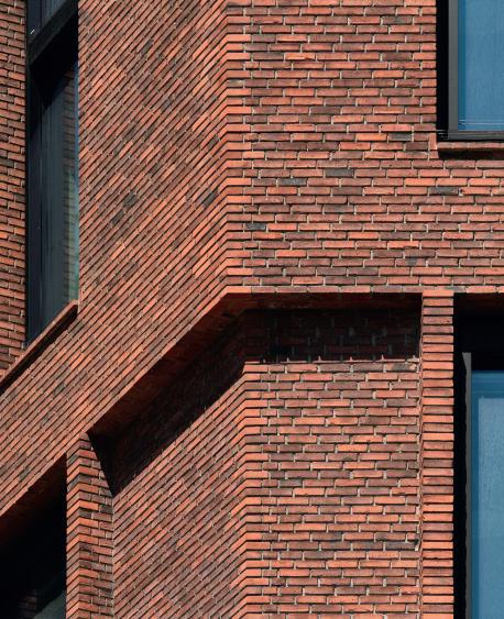 Im Jahr 2009 kamen die Lieblingssteine der Architekten, die roten Ziegel D48 und D49, im schillernden Transvaalbuurt-Viertel von Amsterdam zum Einsatz. Die multikulturelle Begegnungsstätte »Fusion« war der perfekte Ort, um die facettenreichen Farben der gebrannten Erde in einer Fassade zu entfalten, die alle Regeln bricht und eine Hommage an die wilden Ziegel-Eskapaden der Amsterdamer Schule darstellt. »Diese Petersen-Ziegel spiegeln auf wunderbare Weise die Mosaike der muslimischen Ästhetik wider«, sagt Architektin Marlies Rohmer, die die Ziegelei beauftragt hat, die Steine in drei Formaten zu brennen –dänisches Normalformat, Hamburger Format und Flensburger Format (P22-2009). Äußerst raffiniert und ebenso schön in den Kontext eingebettet ist auch die Erweiterung des Museums De Lakenhal im niederländischen Leiden, die unter dem Titel »Interweavings« vorgestellt wurde. Hier wurde ein gelblich-grüner Normalziegel (D190) mit 13 verschiedenen, speziell hergestellten Formziegeln aus demselben Ton ergänzt. »Wir wollten ein Gebäude ohne Ornamente schaffen, das aber in seiner Materialisierung ornamental erscheint«, erläutert Architektin Ninke Happel. »Deshalb haben wir uns für ein Rapportmuster aus Formsteinen entschie-