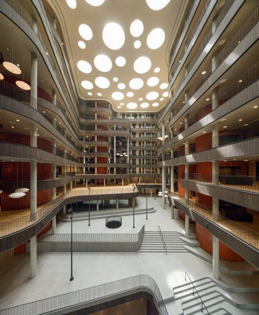 Das Gebäude wurde als Karree mit Gebäudeteilen in unterschiedlichen Höhen und einem begrünten Innenhof entworfen.