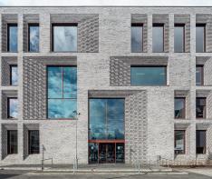 Zu den Höhepunkten der Ziegelsteinkunst gehört das Rathaus im dänischen Vejen, das zeigt, wie reichhaltig man eine Fassade mit einem einfachen, grauen Standardziegel gestalten kann. Das Haus ist eine wahre Explosion aus Reliefs, Kontrast und Tiefe, schattigen Nischen, eingebettet in eine straffe, kubische Form. »Wir haben uns für das Sägezahnmauerwerk entschieden, weil es unter anderem viele kleine Schlagschatten unter den Steinen erzeugt. So entsteht eine Art Pixelierung in der Farbe des Steins, die die Tiefenwirkung verstärkt und sich im Laufe des Tages verändert«, berichtet Architekt Lars Povlsen von Transform Arkitekter (P44-2021).