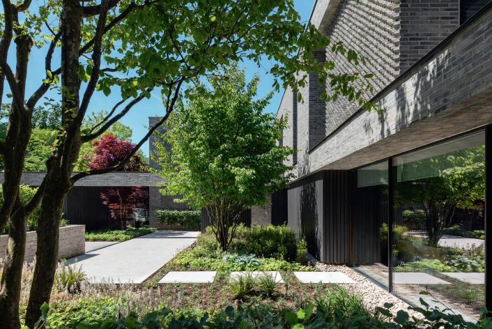 Die Architekten sind ihrem Grundsatz treu geblieben: Die privaten, verborgenen Bereiche wurden aus Ziegeln erbaut, während die Wohn- und Schlafräume aus Glas und Holz geschaffen sind. Da die Schlafräume sinnvollerweise im ersten Stock und die Wohnräume im Erdgeschoss untergebracht