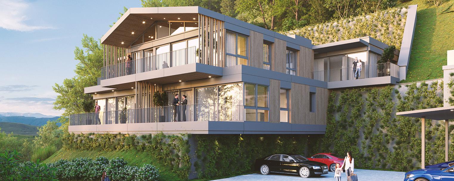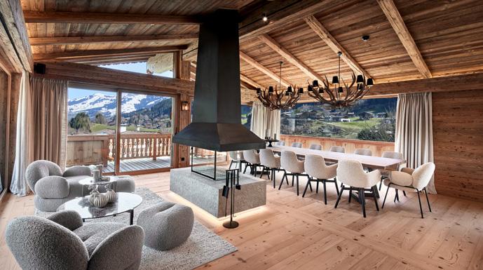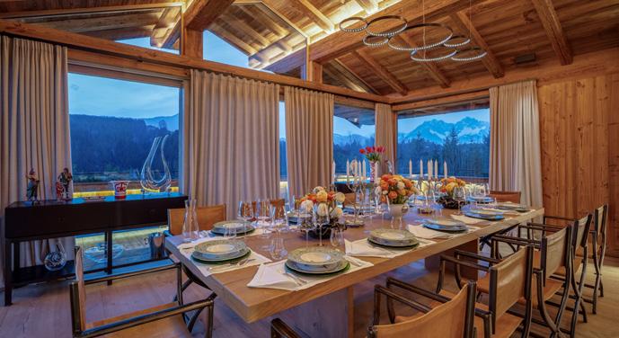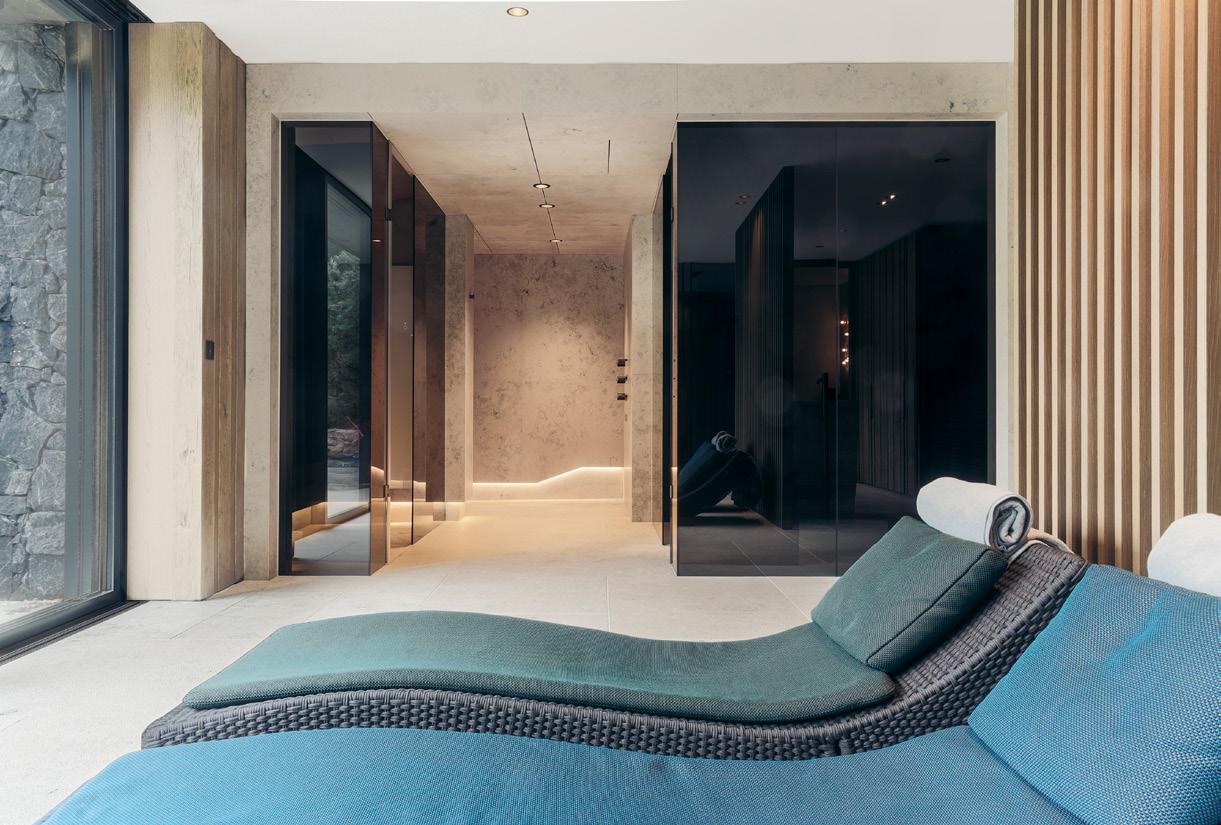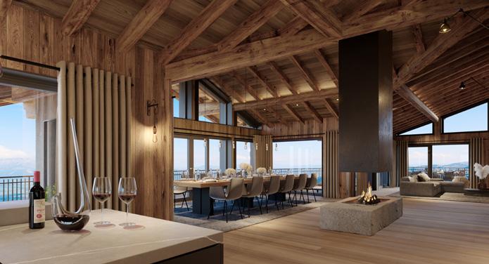 chon bei der Anfahrt vermittelt das – von der Straße aus nicht ersichtliche – Anwesen mit einem großzügigen Vorplatz, mehreren Carportund Garagenplätzen seine außergewöhnliche Präsenz. Das architektonische Konzept kombiniert traditionelle alpine Chalet-Elemente mit moderner, zukunftsorientierter Gestaltung zu einer luxuriöseleganten Gesamtkomposition. Kannelierte Säulenund Strukturelemente, edelste Materialien und ein ikonischer Glas-Lift schaffen ein unvergleichliches Wohnambiente.