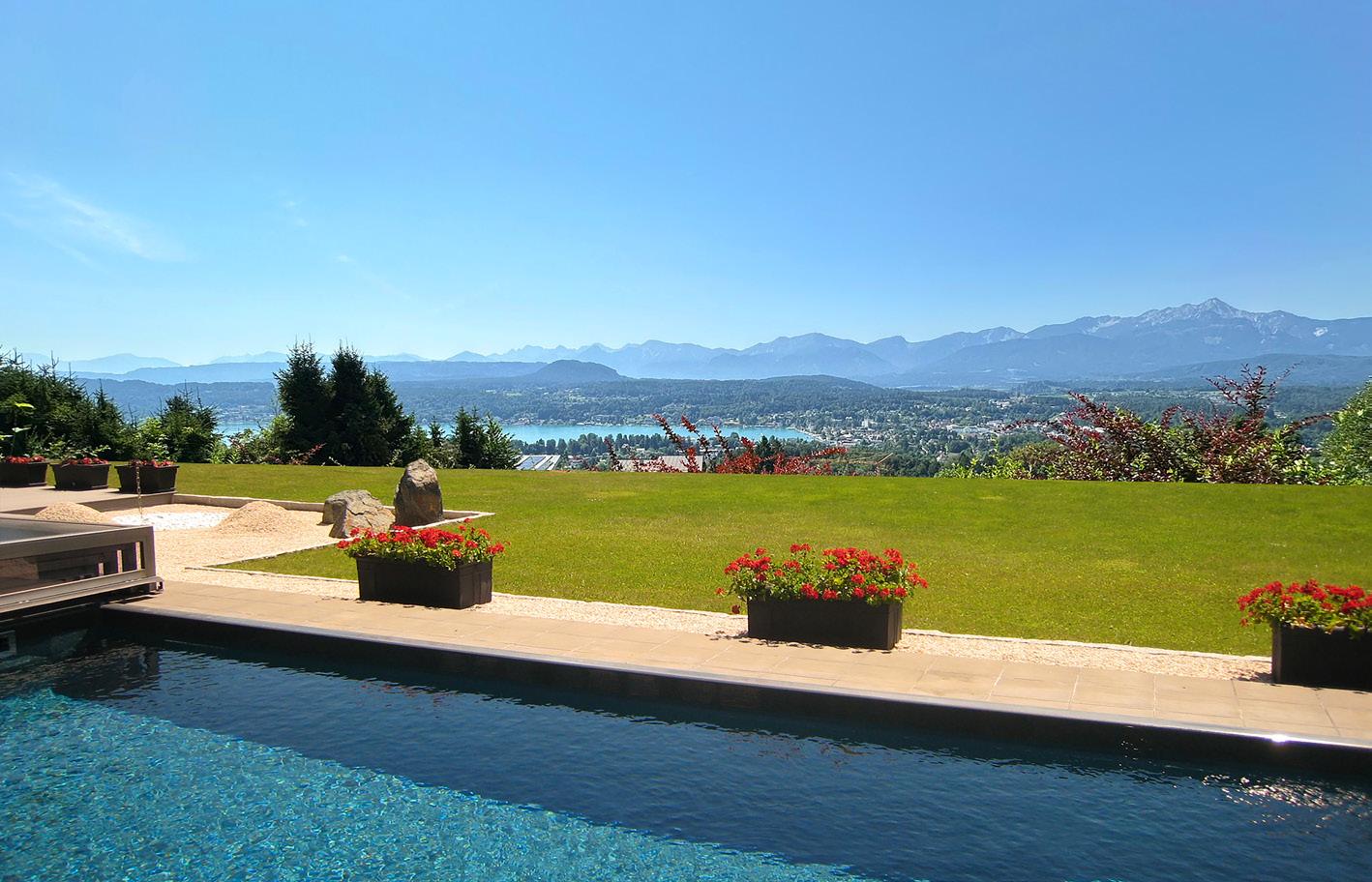 and relaxation zone. The elegant high-end wine cellar and a stylish multimedia room make extraspecial enjoyments possible. A heated outdoor swimming pool with spectacular views into the far distance rounds out the spectrum of luxurious offerings.