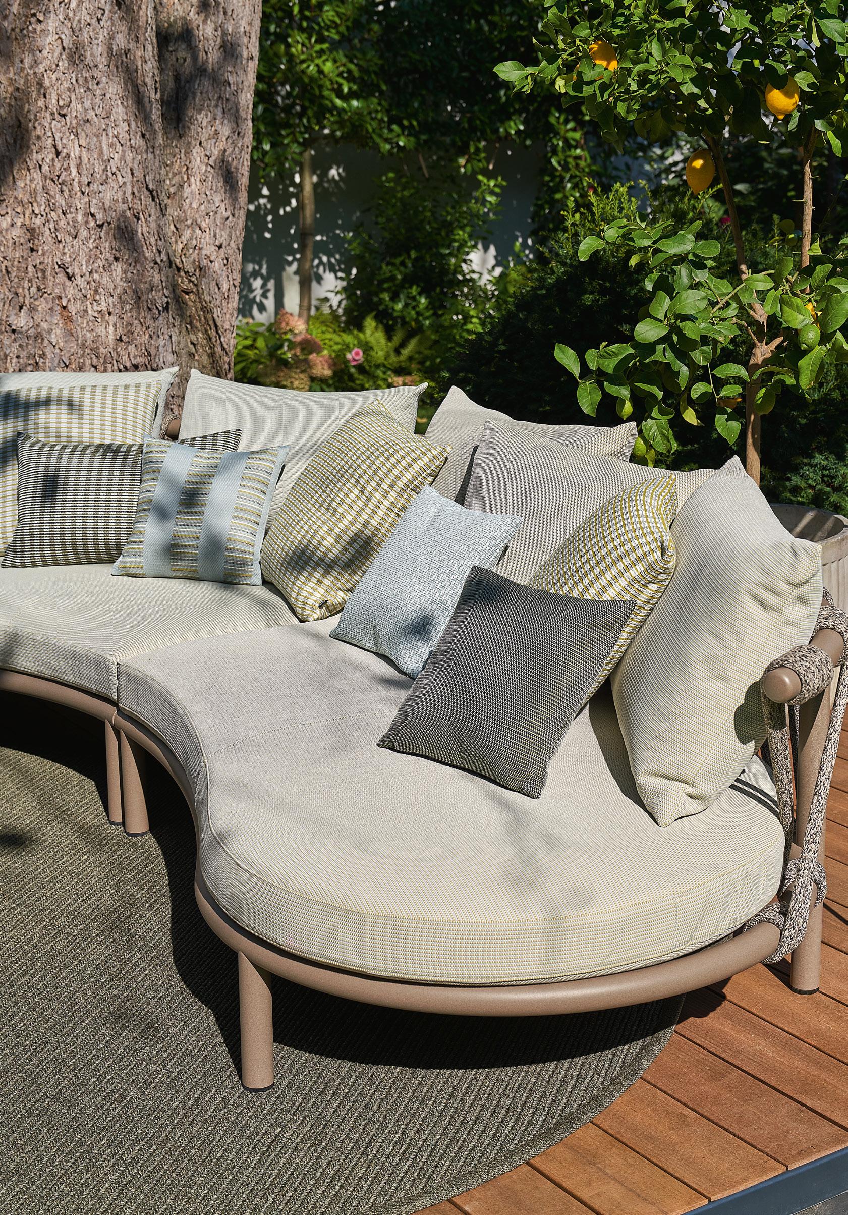Zur Auswahl stehen Faux-Unis, Streifen und geometrische Kleinmuster in jeweils fünf Farbwelten. Außerdem erfüllen die funktionalen PolypropylenStoffe alle Anforderungen an die Nutzung im Außenbereich: hohe Lichtechtheit, Salz- und Chlorwasserbeständigkeit sowie Waschbarkeit. Die in Italien hergestellte, OEKO-TEX®-zertifizierte Ware steht für moderne, strapazierfähige Qualität und Langlebigkeit im Wohn- wie im Außenbereich und setzt stilvolle Akzente mit hohem Komfortfaktor.