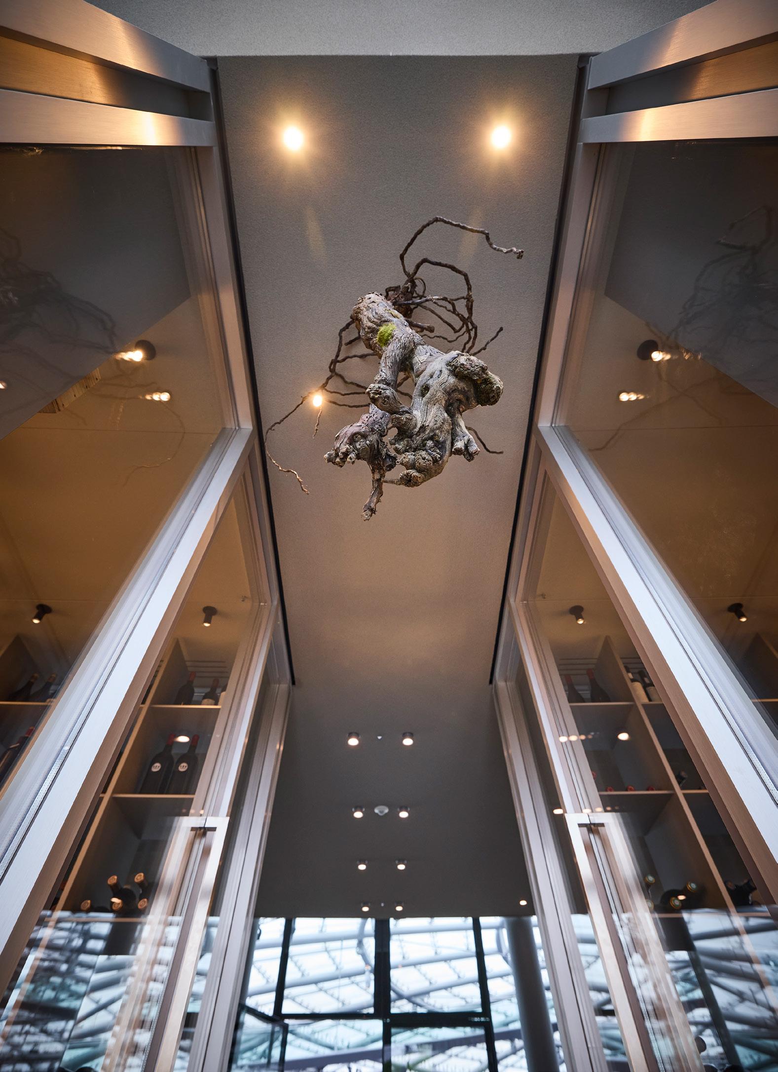 RESTAURANT IKARUS WURDE NEU INSZENIERT. DAS FOYER ERHIELT NEBEN EINEM BEGEHBAREN WEINSCHRANK EINE IKARUS-SKULPTUR ALS ZENTRALES ELEMENT.