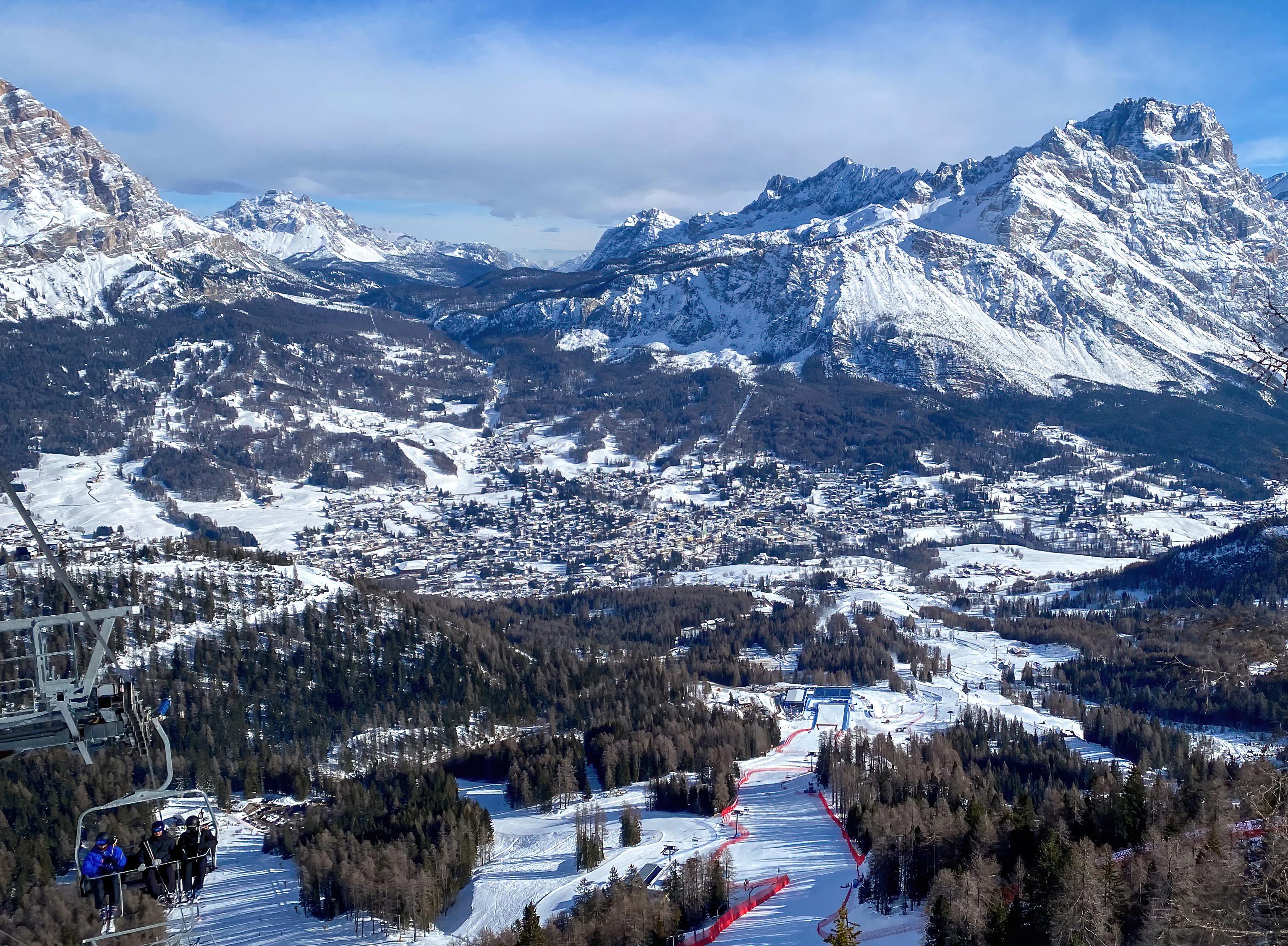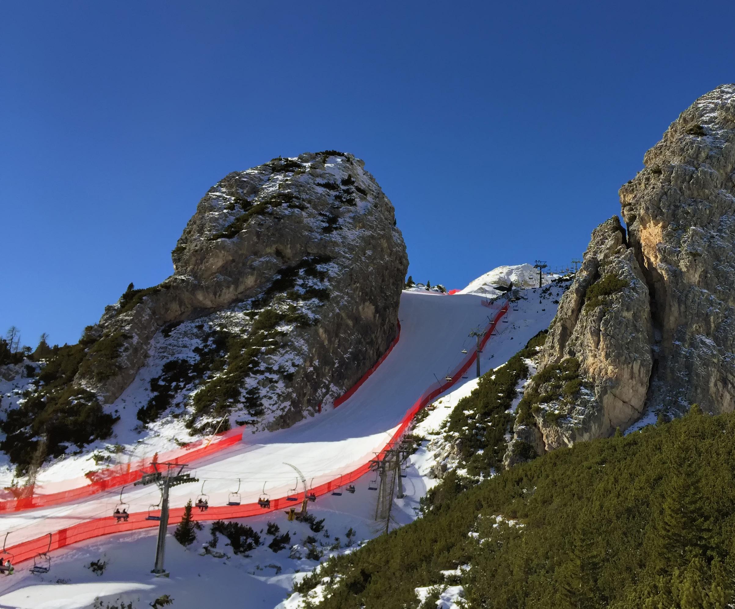 Bei 64% Gefälle erreichen die SkiWeltcup-Abfahrerinnen beim anspruchsvollen „Tofana-Schuss“ auf der „Olimpia delle Tofane“ mehr als 130 km/h Geschwindigkeit.