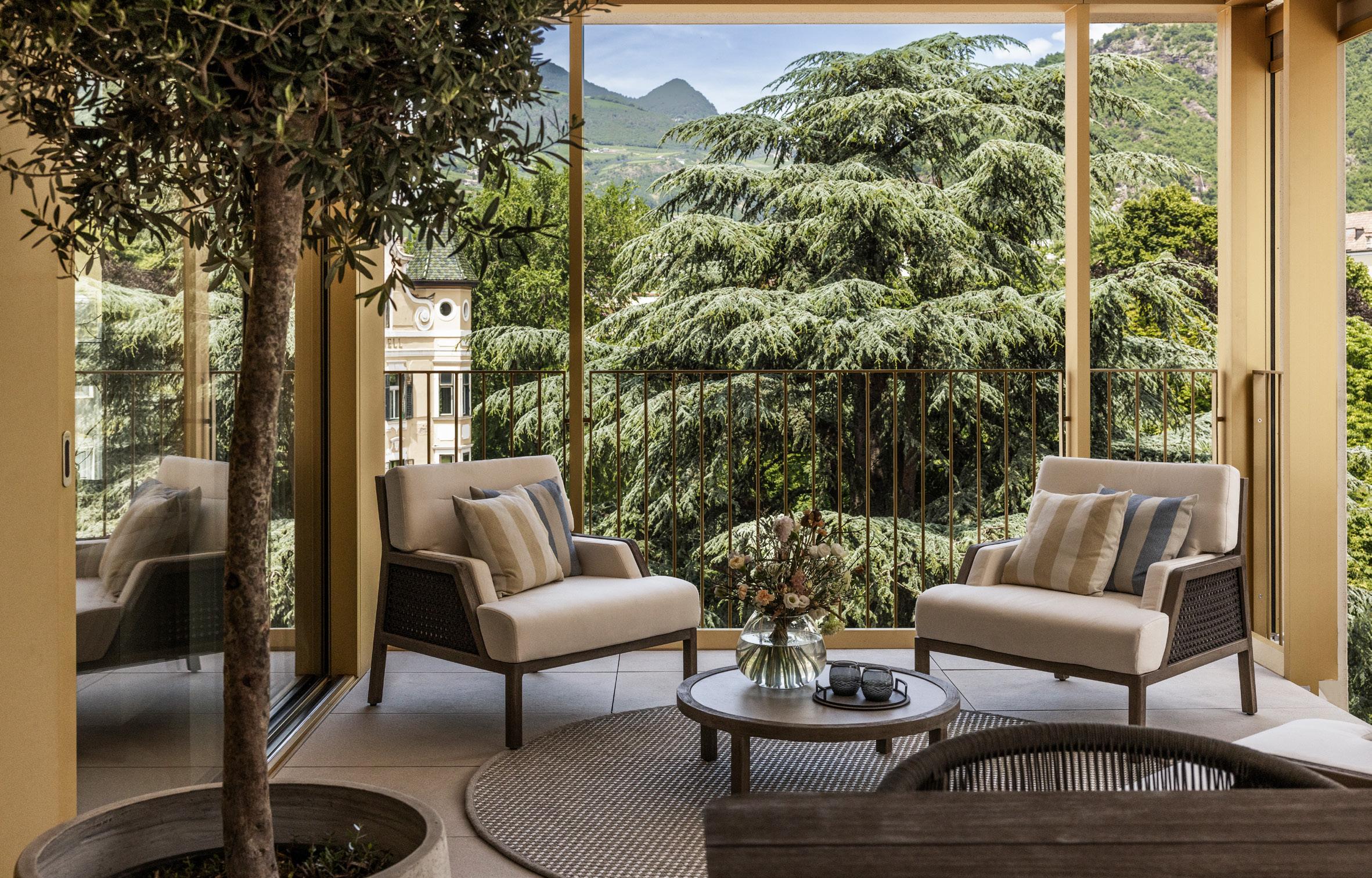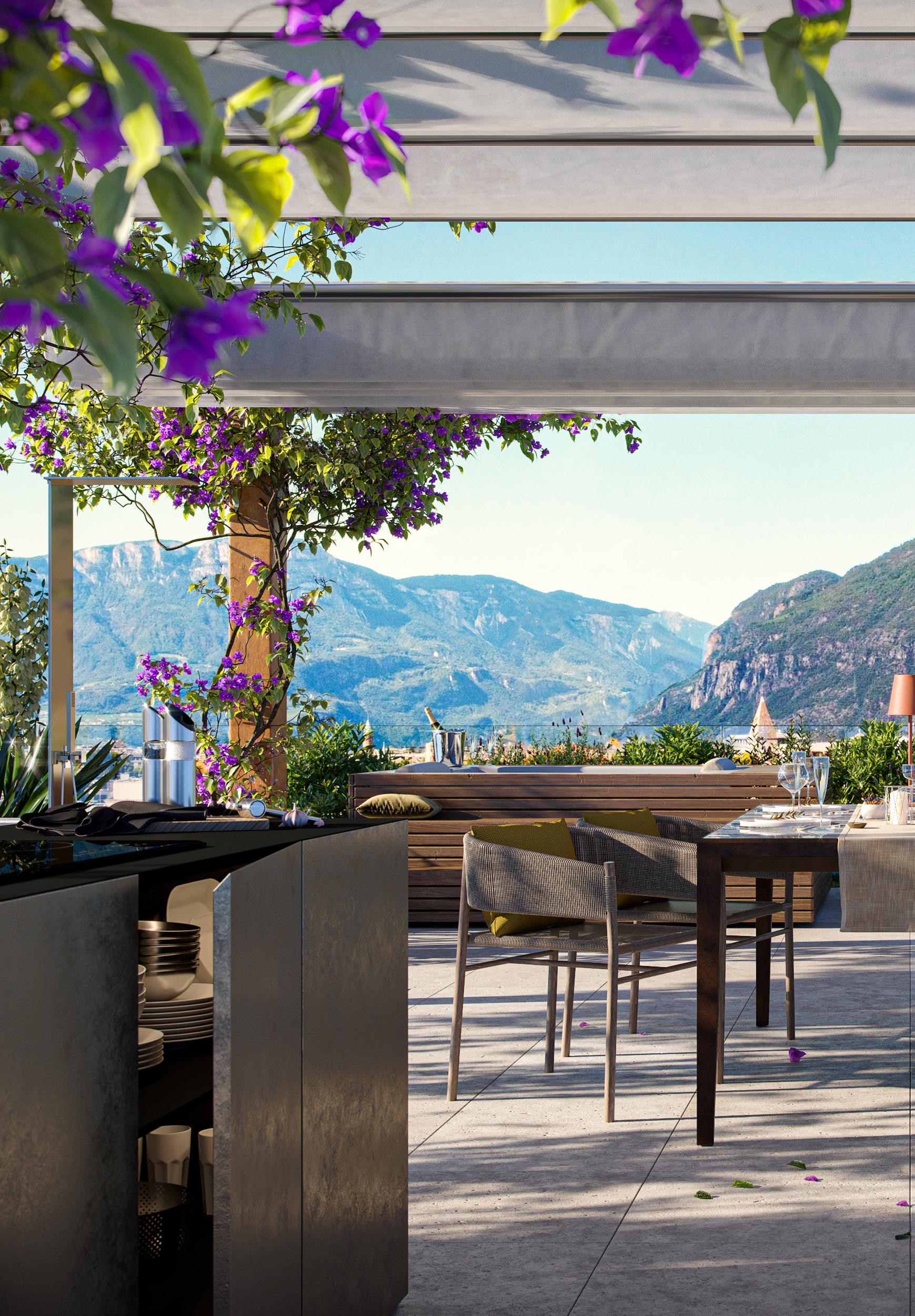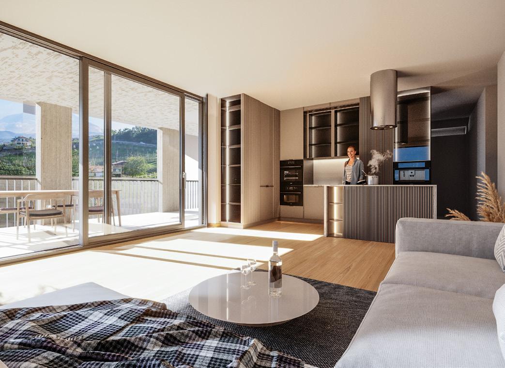Ob stilvolle Zwei-Zimmer-Wohnung, großzügiges Zuhause für die ganze Familie oder exklusives Penthouse: Alle Wohnungen verfügen über weitläufige Terrassen, Loggien, Balkone oder Gärten und bieten einen eindrucksvollen Blick auf die Südtiroler Berglandschaft.