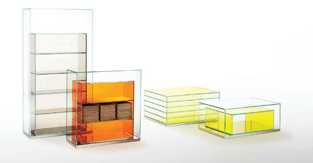 advantage of color and, under the creative direction of designer Piero Lissoni, invited renowned designers such as Mario Bellini, Philippe Starck, Patricia Urquiola and Yabu Pushelberg. Among the highlights is the Box in Box line, created by Philippe Starck, which focuses on functionality and consists of a series of tables, boxes and open furniture designed as a box in a box. Combining color and transparency, the pieces are made of extra light glass with a polished stainless steel base.