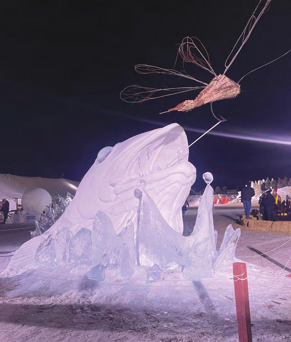 Get some mini donuts and take in the most beautiful sculpture I’ve ever seen at the festival — “Libellule s’envole” — a walleye leaping for a dragonfly. The fish’s snowy head and body twist from the earth. Reflex captured. Spires of ice spray from the gap in the surface, some crested with clear orbs. Energy frozen. The dragonfly — bent sticks bound together on closer inspection
