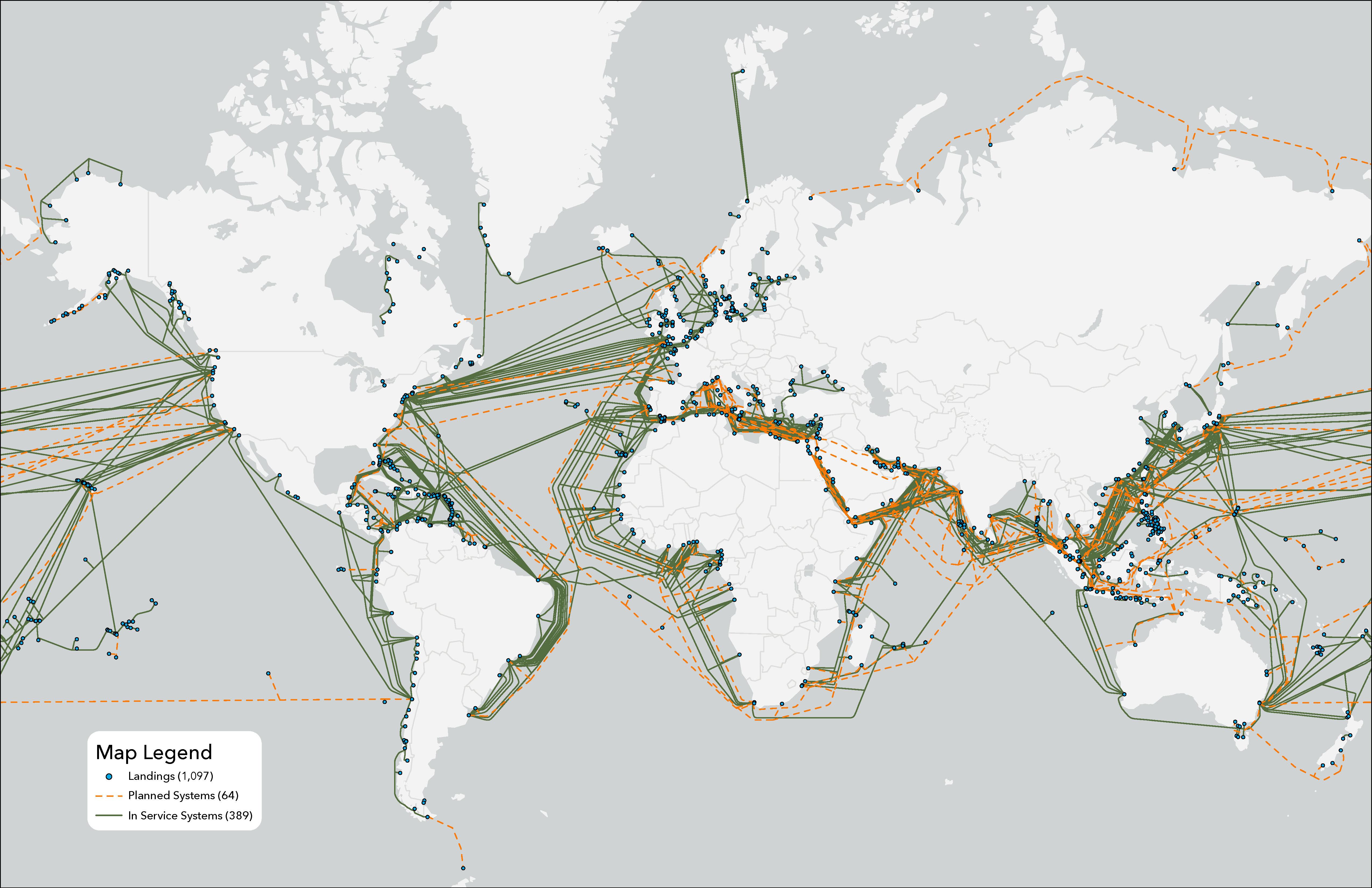 The Submarine Cable Database is maintained by a dedicated team and powered by MySQL. Maps are produced with ArcGIS Pro, in the same visual style as the Submarine Cables of the World print map.