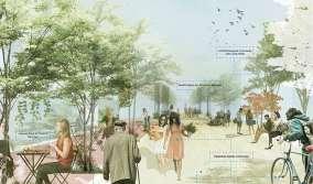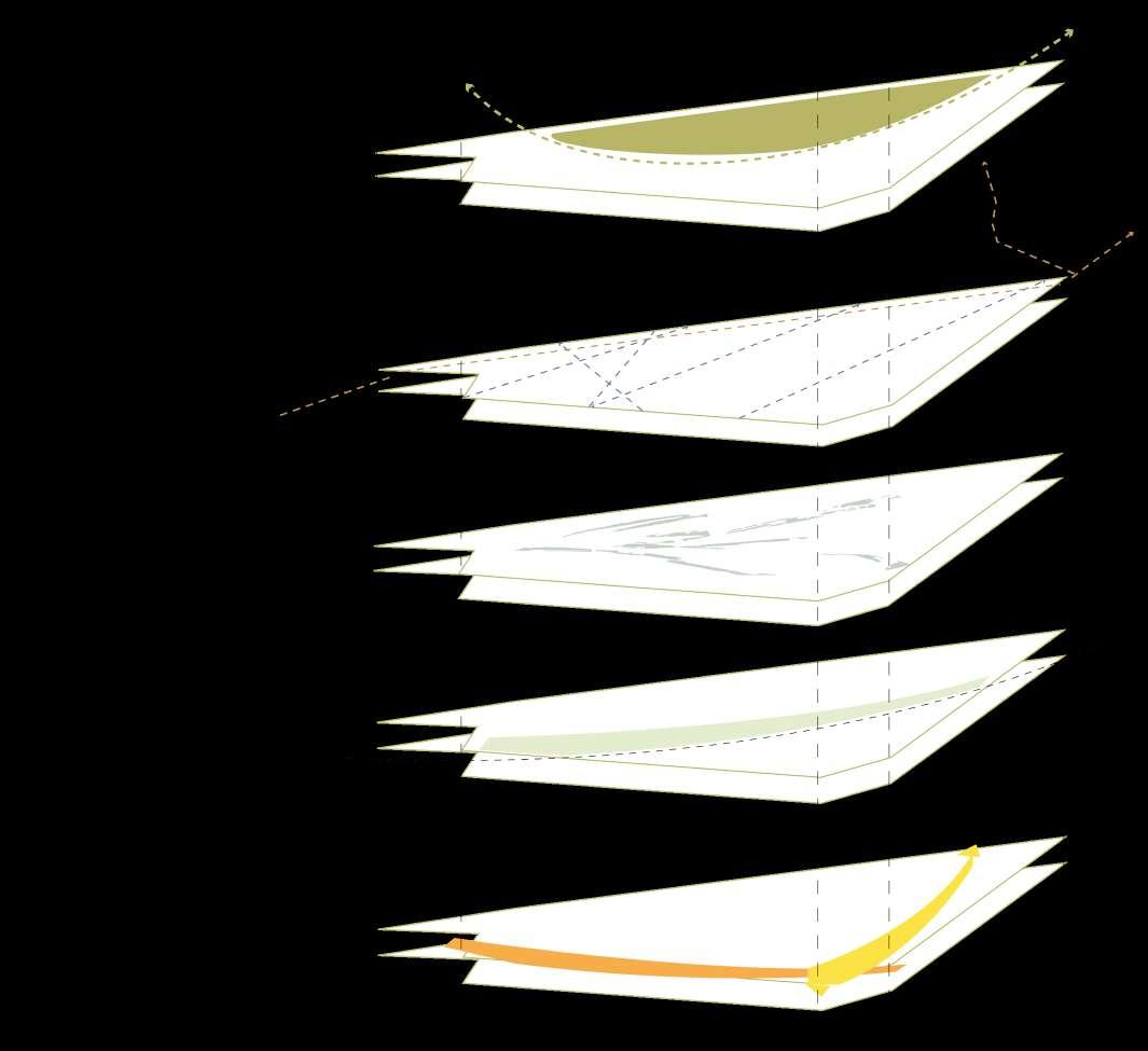 The layers are: the site will be divided into three different levels of sparseness, with the middle level being flatter and looser, dominated by low wilderness plants and lawns, and the sides being more dense with large trees. The structure of the layers will provide structural support for the urban breezeway.