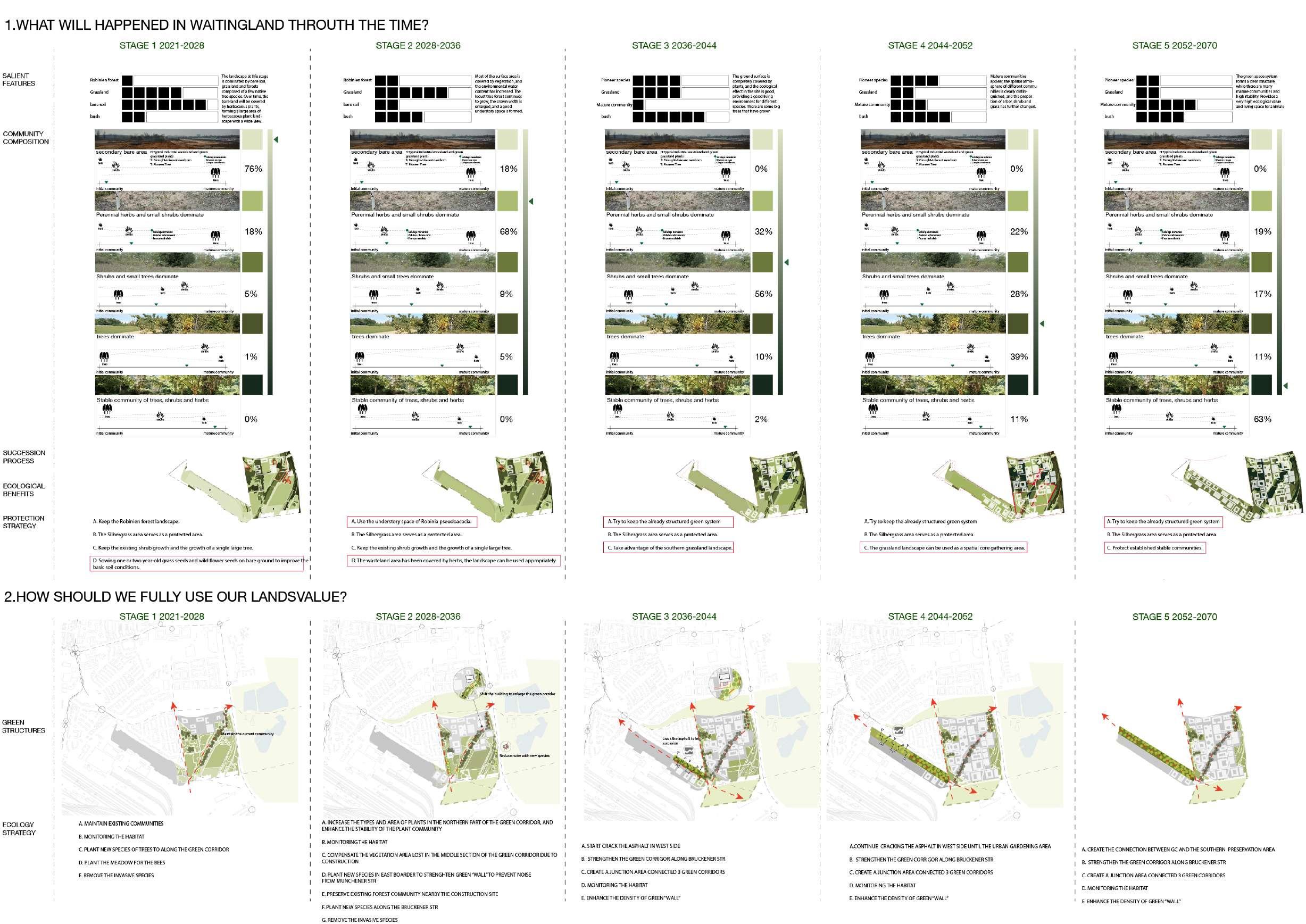 The results of this study show that if left unchecked the area as a whole will develop a series of spaces closer to native nature. This provides a new way of thinking about the work of landscape architects: how do we strike a balance between design and non-design? In this project, it might be a more economical and ecological solution if we don’t rush to build these waitinglands, but leave nature some time to grow and then skillfully use the free benefits that nature brings.