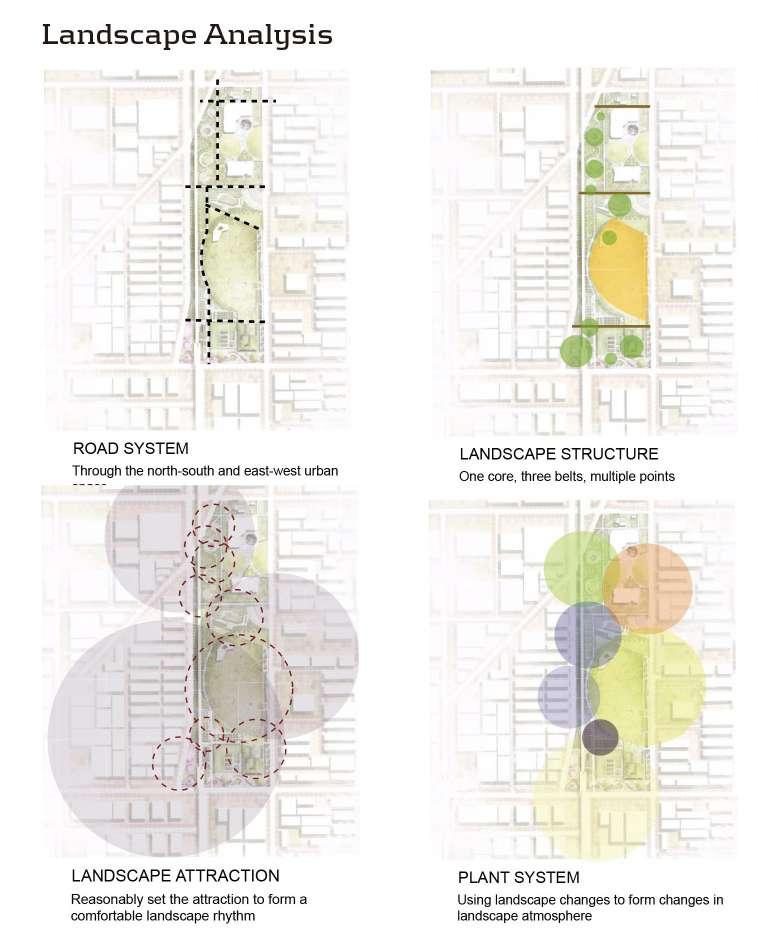 The design will take different solutions to different objectives and combine them to form a complex system of interconnected and influential but dynamic urban public green spaces.