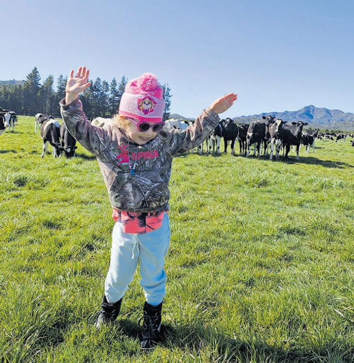 Ellie, 5, enjoying the sun while moving heifer calves in Rangitaiki.