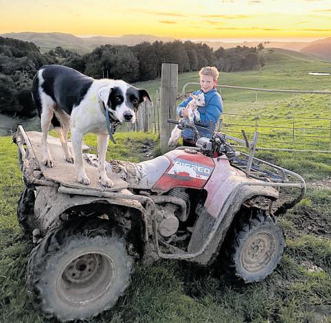 Eli, 10, and Tui the dog helping out on the late lambing beat in Tuakau.