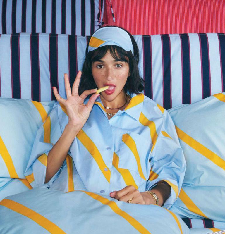 Finnish design house Marimekko and New York-based artist Laila Gohar launched their playful bedroomthemed capsule collection globally in September 2025. Inspired by all the things we do in bed and Gohar’s maxim, if it’s ironed, you can wear it out, the capsule collection features a series of bedroom-themed items that Gohar curated, featuring distinctly bold and contrasting Marimekko archive stripes by artist Maija Isola.