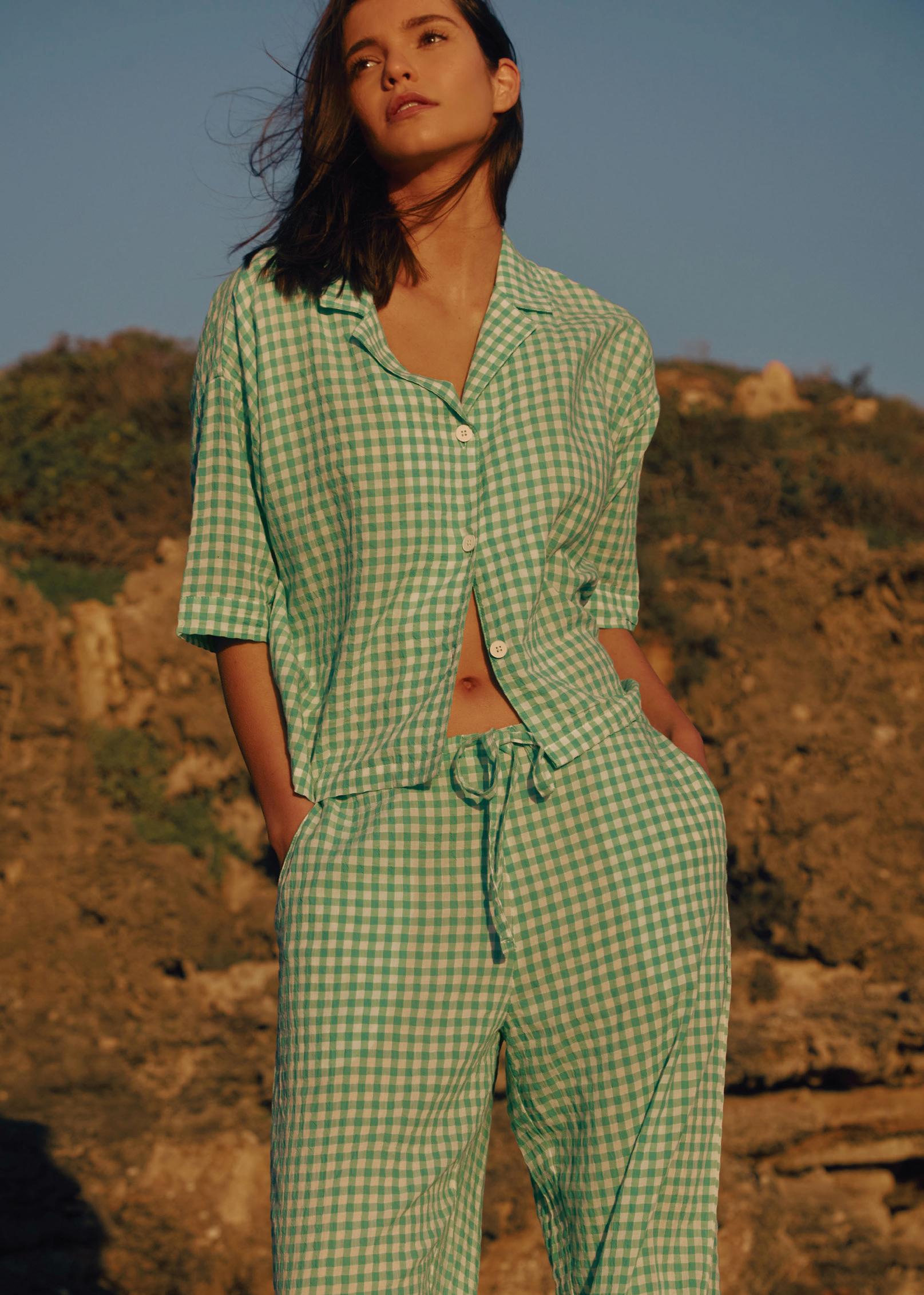 Papinelle has made thoughtful choices at every stage of the design process. For this collection, this meant incorporating ‘made with Uluu’ seaweed buttons into the turquoise gingham pyjama set.