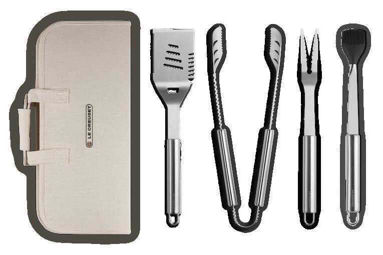 This bundle is the perfect gift for outdoor cooking enthusiasts. It includes four stainless steel utensils – a Slotted Turner, Two-Pronged Fork, Tongs and Basting Brush –and an elegant, neutral carry bag, branded with Le Creuset, that keeps grilling accessories organised, accessible and safe.