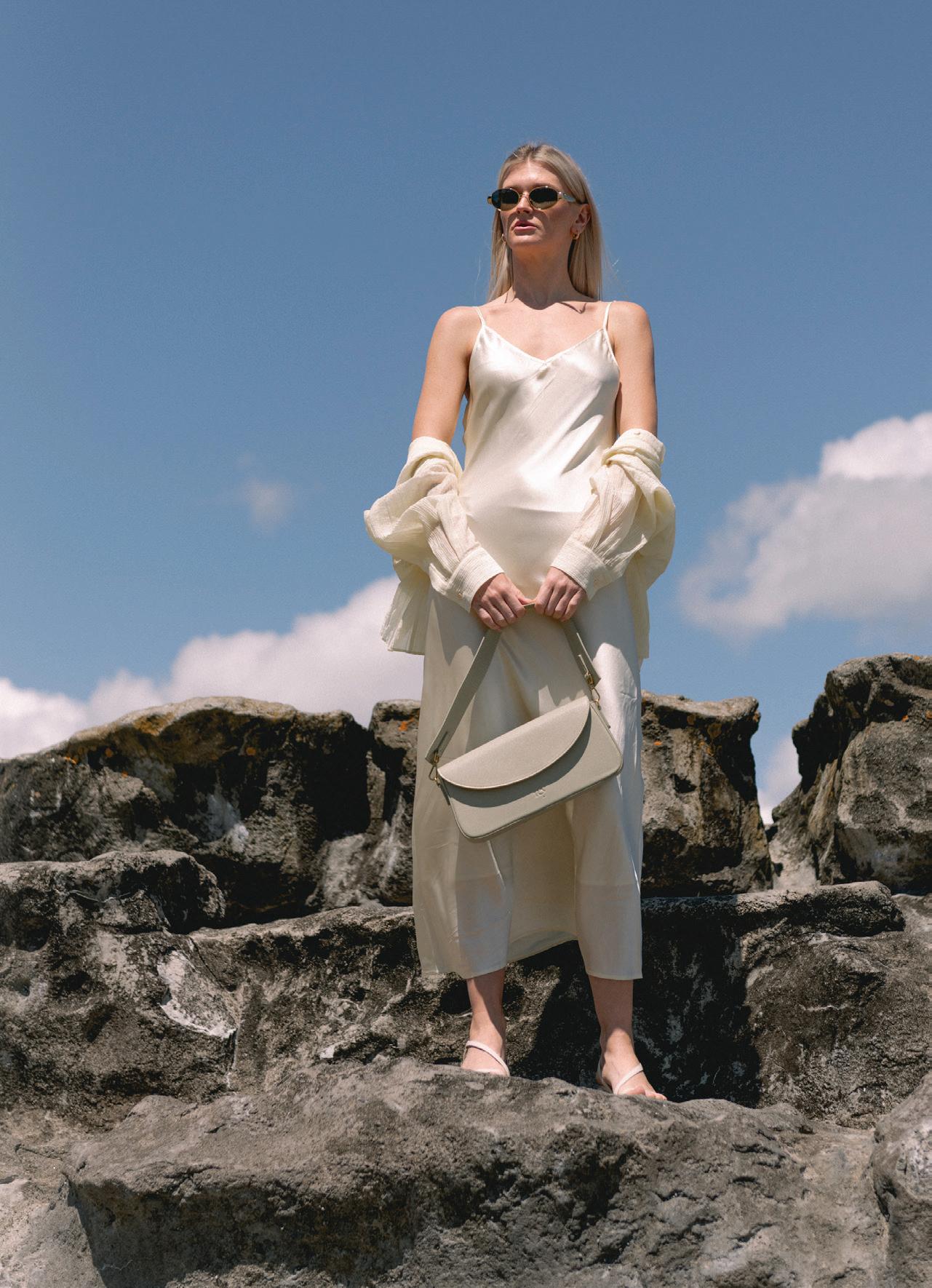 The Button Bow leather bags collection is a new creative collaboration between Polène and Irish womenswear designer Róisín Pierce.Known for her contemporary approach to Irish artisanal whitework embroidery and unique silhouettes, the brand’s eponymous designer expands her poetic vision to leather, reconciling form and craft to conceive two sculptural bags handcrafted by Polène in Ubrique, Spain. Designed as objets d’art, each limited-edition bag is adorned with intricate buttons and bows, hand-stitched by skilled artisans into an elegant lattice echoing Róisín Pierce's creative world.