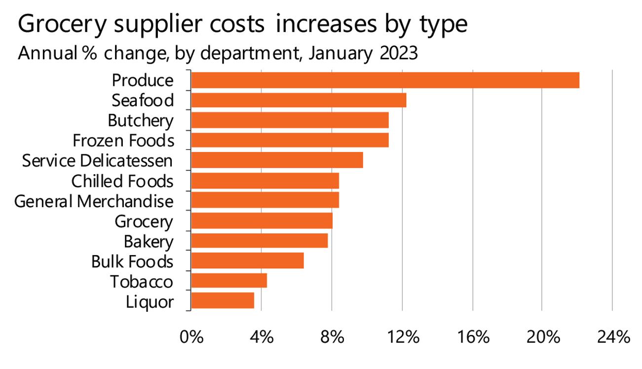 “Supplier costs remain higher than a year ago across all departments. Produce costs have risen considerably in the last year, up by 22 percent pa in January 2023. Recent bad weather across the country is expected to reduce production and yields of some food items which, combined with sustained inflationary pressures, will keep supplier costs high,” said Olsen.
