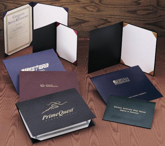 The lower cost alternative to present a certificate in style. The paper certificate cover is made of 80# Curtis Linen matte finish cover stock. The foil scroll border is standard and enhances logos which can be foil stamped in the center. The paper certificate cover will hold certificate sizes of 81/2x11" or 8x10" in die cut corners on the back cover. The corners of the certificate will show on the back side of the certificate cover